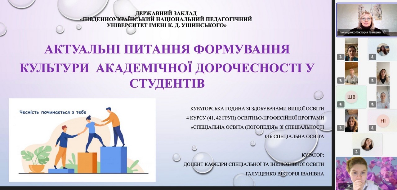 Суттєвий внесок у формування культури доброчесності здійснили викладачі кафедри спеціальної та інклюзивної освіти. Олена Начинова провела кураторську годину «Академічна доброчесність як умова якісної освіти», Вікторія Галущенко організувала воркшоп «Актуальні питання формування культури академічної доброчесності у студентів», Лариса Арнаутова – кураторську годину «Академічна доброчесність – основа якісної освіти», а Ольга Форостян – круглий стіл «Академічна доброчесність в освітньому середовищі».