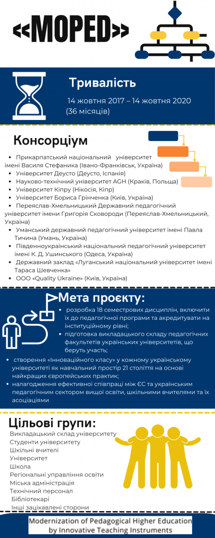 Проєкт MoPED спрямований на модернізацію навчальних програм для педагогічних шкіл України шляхом включення нових курсів найвищих навчальних засобів ІКТ та методів дослідження. Відповідаючи на сучасні виклики та вимоги, а також підтримуючи масштабні масштабні освітні реформи в Україні, проект вплине на якість педагогічної вищої освіти та підвищить цифрові та дидактичні компетенції майбутніх вчителів школи.