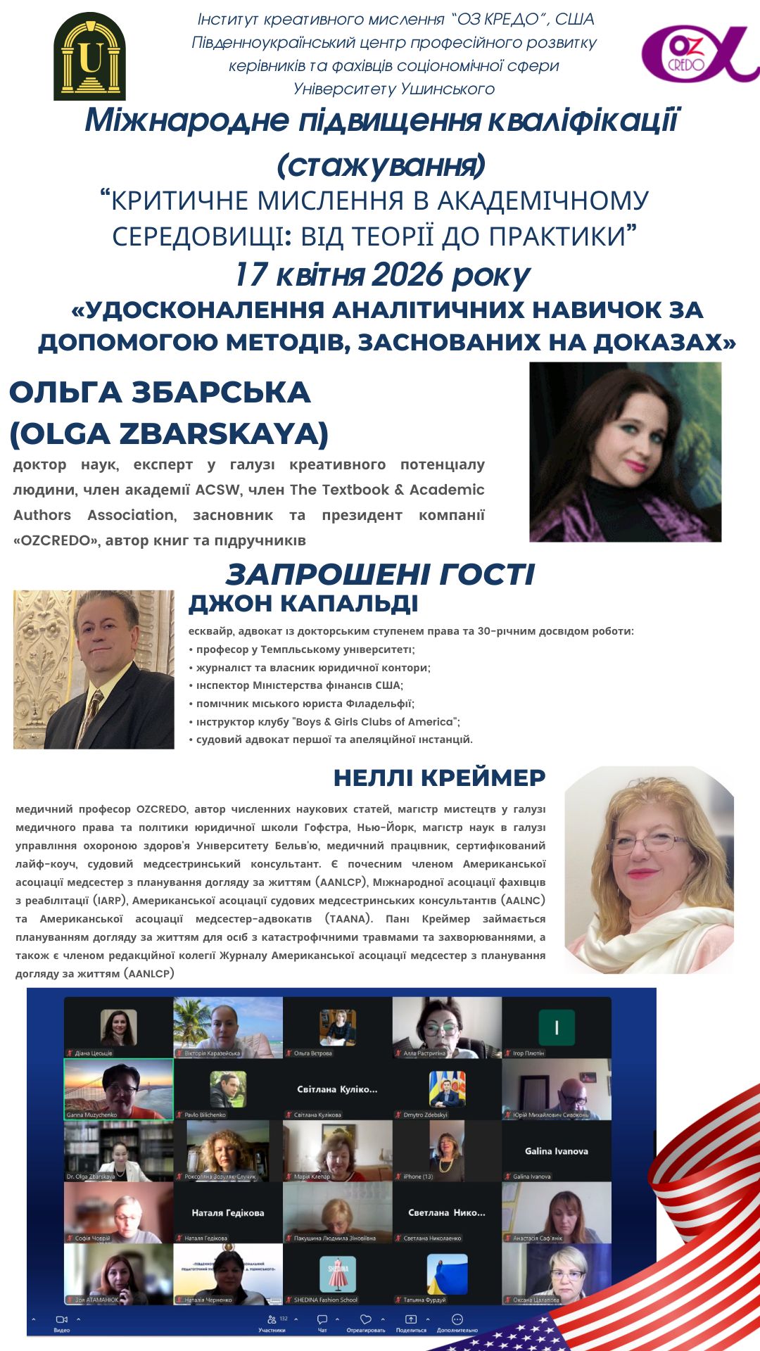 Наступна зустріч відбудеться 24 квітня 2026 року о 16:00 (п`ятниця) за модулем: ” Практикум з креативного мислення за авторською методикою проф. Ольги Збарської”!
