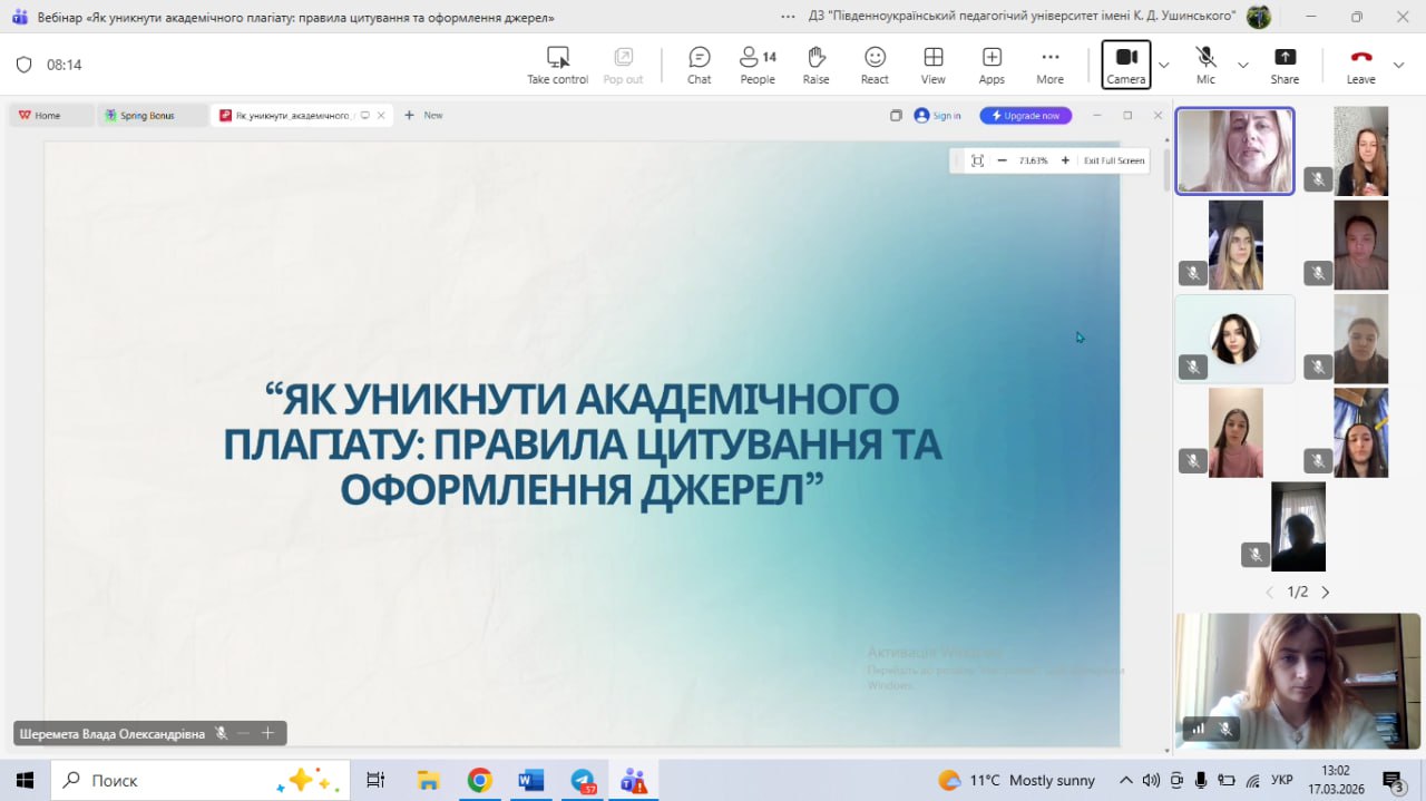 17 березня зі студентами третього курсу спеціальності 012 «Дошкільна освіта» було проведено вебінар на тему «Як уникнути академічного плагіату: правила цитування та оформлення джерел». У межах вебінару учасники були ознайомлені із Законом України «Про академічну доброчесність», його ключовими положеннями та вимогами до виконання навчальних і наукових робіт; розглянуто сутність академічної доброчесності, основні види плагіату та способи його уникнення. Значну увагу приділено правилам цитування, оформленню списку використаних джерел відповідно до чинних стандартів.