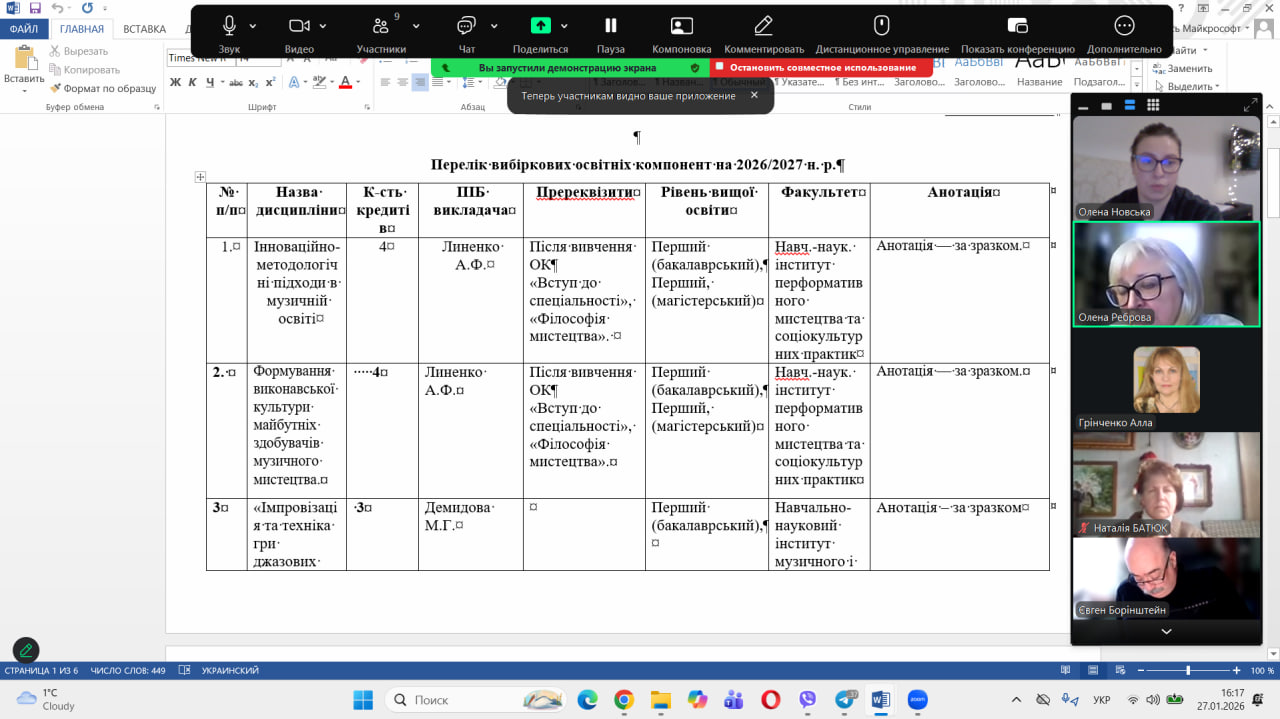 27 січня 2026 року відбулося засідання комісії з якості освіти Навчально-наукового інституту музичного і перформативного мистецтва та соціокультурних практик, одним із ключових питань якого стало обговорення актуальності вибіркових компонентів, запропонованих здобувачам вищої освіти.