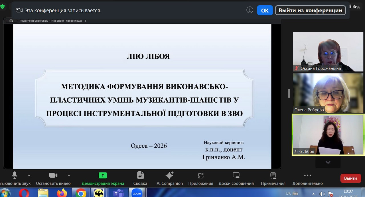 16 січня 2026 року о 10.00 на платформі Zoom відбувся публічний захист дисертаційного дослідження аспірантки кафедри музичного мистецтва і хореографії Лію Лібоя на тему: «Методика формування виконавсько-пластичних умінь музикантів-піаністів у процесі інструментальної підготовки в ЗВО», поданого на здобуття наукового ступеня доктора філософії в галузі знань 01 – Освіта/Педагогіка, спеціальність 011 Освітні, педагогічні науки. Актуальність теми дисертаційної роботи.