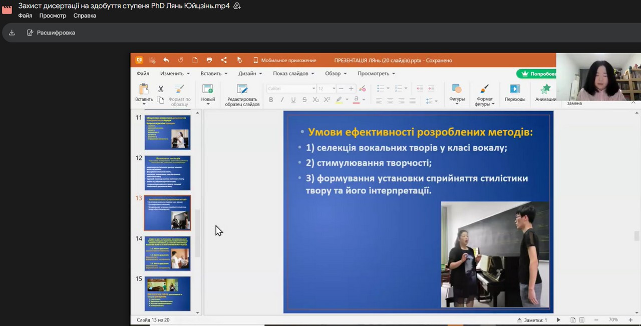 15 січня 2026 року о 14.00 на платформі Zoom відбувся публічний захист дисертаційного дослідження аспірантки кафедри музичного мистецтва і хореографії Лянь Юйцзінь на тему: «Методика підготовки майбутніх учителів музичного мистецтва до стильової інтерпретації вокальних творів на основі герменевтичного підходу» на здобуття наукового ступеня доктора філософії за спеціальністю 014 – Середня освіта (Музичне мистецтво). Науковий керівник дослідження – професор Шип С.В., доктор мистецтвознавства, професор кафедри музичного мистецтва і хореографії.