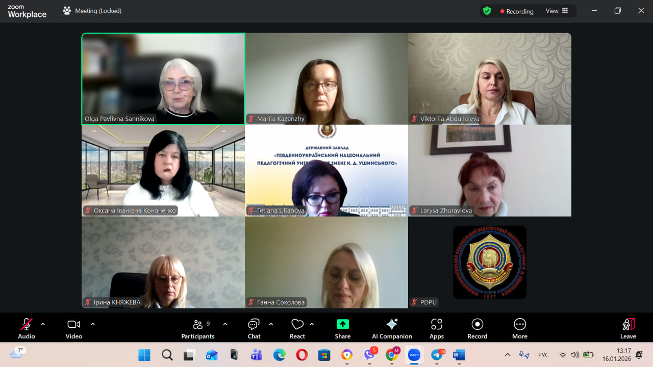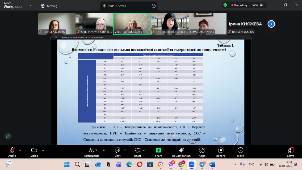 В Університеті Ушинського 16 січня 2026 року на платформі Zoom відбулося засідання разової спеціалізованої вченої ради з захисту дисертації аспірантки Університету Ушинського Вікторії АБДУЛЛАЄВОЇ з теми «Практика надання психологічної допомоги в адаптації вимушено переміщеним особам з України» на здобуття наукового ступеня доктора філософії зі спеціальності 053 Психологія.