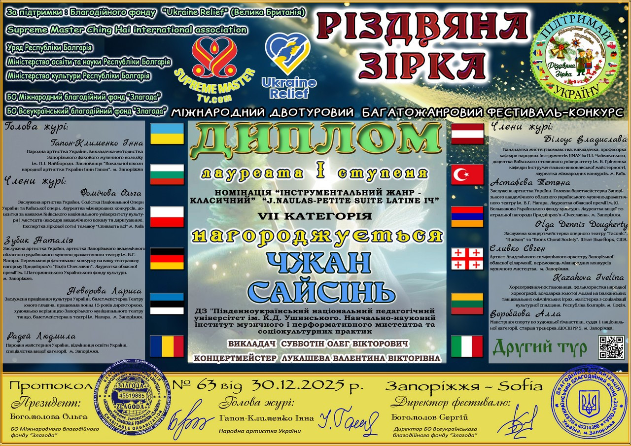 Чжан Сайсінь – Лауреат 1 ступеня – Двотуровий міжнародний багатожанровий фестиваль-конкурс «Різдвяна Зірка» м.Запоріжжя. Другий тур було проведено 29.12.2025 року. Результати отримані вже після свят у 2026 році. ! Конкурс проводиться за підтримки : Уряду Республики Болгарія; Міністерства освіти та науки Республіки; Болгарія, Міністерства культури Республики Болгарія; Благодійного фонду “Ukraine Relief” (Велика Британія); Supreme Vaster Ching Hal International association. Викладач нашого переможця – Олег Вікторович Субботін