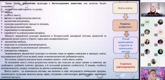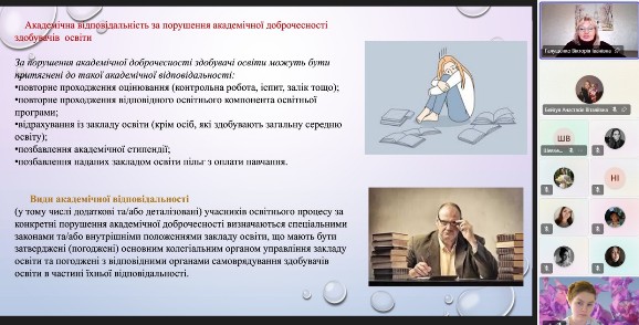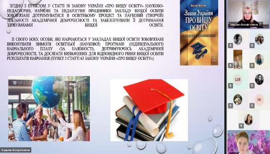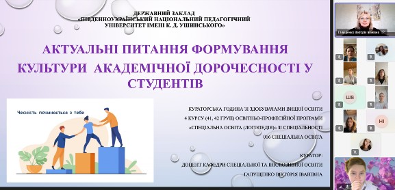 18.03.2026 року під час воршопу у кураторську годину зі здобувачами вищої освіти 4 курсу освітньо-професійної програми «Спеціальна освіта (Логопедія)» зі спеціальності 016 Спеціальна освіта доцентом Галущенко Вікторією Іванівною була організована та проведена зустріч за темою: «Актуальні питання формування культури академічної доброчесності у студентів», де були визначені поняття доброчесності та обговорення її у майбутній професії а також визначено основні принципи її дотримання та порушення. Студенти також отримали пропозиції щодо підвищення рівня академічної доброчесності. Учасники зустрічі з великою цікавістю слухали доповідь, ставили запитання та мали можливість порівняти, як дотримання академічної доброчесності впливає на розвиток науки. Проведення означеного заходу стало традиційно важливим кроком у формуванні відповідальної освітньої культури та підвищення рівня усвідомлення учасників освітнього процесу щодо основних принципів чесного навчання, було реалізовано низку інформаційних, навчальних та інтерактивних напрямків, що сприяють зміцненню моральних цінностей, відповідальності та поваги в академічному середовищі.