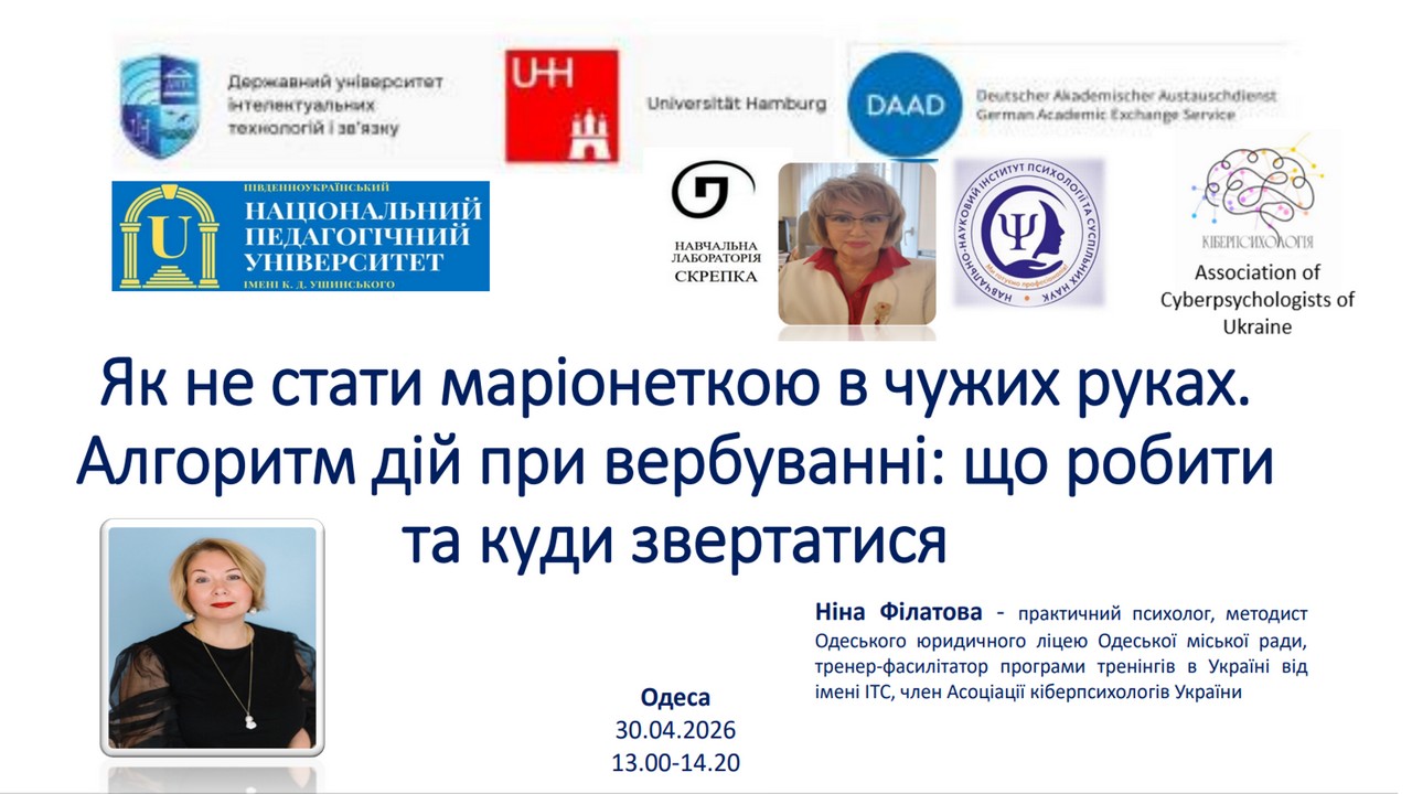 30.04.26 відбувся онлан-тренінг у навчальній лабораторії «СКРЕПКА» з актуальної проблеми протидії й запобіганню вербуванню молоді з метою скоєння терористичних актів і диверсій, що проведено в межах реалізації спільної міжнародної програми ДУІТЗ та проєкту DAAD «Транснаціональні освітні та дослідницькі стратегії проти цифрової ненависті».