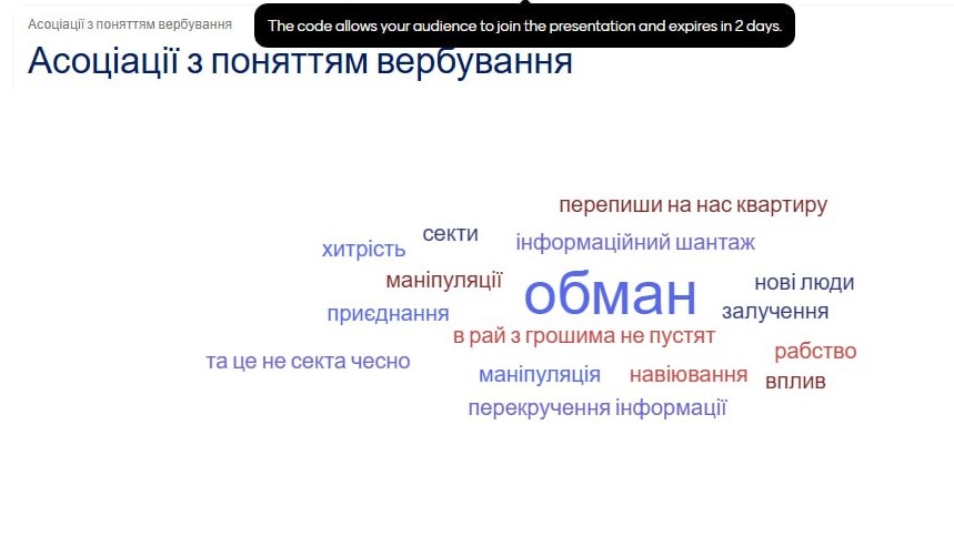 Слухачі відмітили переваги заходу як практичного керівництва, що поєднуює теорію з дієвими вправами, алгоритмами дій при вербуванні й сучасними, випробуваними в світі та збагаченими вітчизняним досвідом, ефективними інструментами самодопомоги та психосоціальної підтримки в складних умовах будь-яких кризових обставин.