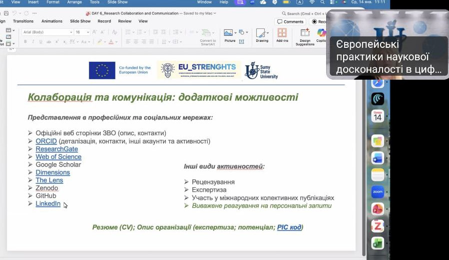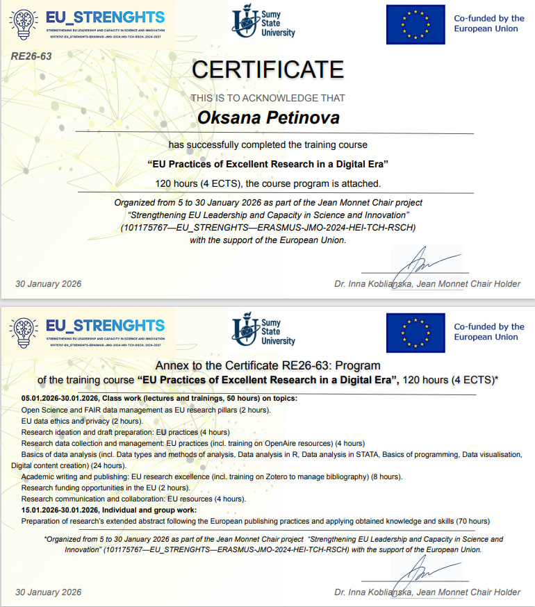 Викладачі кафедри постійно підвищують свою кваліфікацію та беруть участь у різних заходах. Проф. Петінова О. Б. пройшла навчання за курсом «Європейські практики наукової досконалості в цифрову еру» (2026, 4 ECTS), що був організований у межах реалізації проєкту Кафедри Жана Моне «Зміцнення лідерства та спроможності ЄС у сфері науки та інновацій» (101175767 – EU_STRENGHTS – ERASMUS-JMO-2024-HEI-TCH-RSCH, 2024–2027) кафедрою економіки, підприємництва та бізнес-адміністрування Сумського державного університету під керівництвом к.е.н., доцента Інни Коблянської. Особливо цінним є поєднання європейських дослідницьких практик, етичних засад науки та практичних інструментів роботи з даними. Програма курсу охоплювала ключові напрями сучасної наукової діяльності в ЄС, зокрема: відкриту науку та FAIR-управління даними як основу досліджень у ЄС; етику даних та питання приватності; підготовку та дизайн дослідження відповідно до європейських стандартів; збирання, управління та аналіз дослідницьких даних; практичні тренінги з OpenAIRE, R, STATA; академічне письмо, публікацію результатів досліджень та роботу з Zotero; можливості фінансування досліджень у ЄС, а також наукову комунікацію і колаборацію.