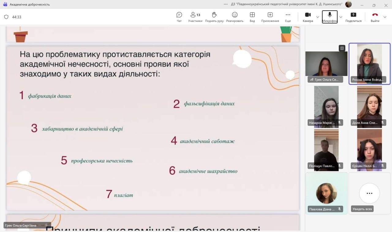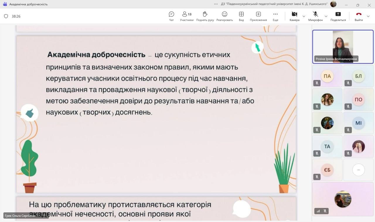 19 березня 2026 року в рамках Тижня доброчесності кафедра теорії та методики практичної психології провела захід «Академічна доброчесність в сучасному дискурсі» для здобувачів 2 курсу першого (бакалаврського) рівня ОПП «Психологія». Спікером заходу виступила Ірина Володимирівна Розіна, кандидат психологічних наук, доцент кафедри теорії та методики практичної психології. Під час заходу було розглянуто академічну доброчесність як сукупність етичних принципів і визначених законом правил, якими мають керуватися учасники освітнього процесу під час навчання, викладання та наукової діяльності. Особливу увагу було приділено актуальності цієї теми в умовах глобалізації знань і цифровізації освіти, коли питання відповідальності за інформацію, коректного використання джерел, етики дослідження та прозорості методів набувають особливого значення. У межах зустрічі здобувачі освіти ознайомилися з ключовими поняттями академічної доброчесності, зокрема з такими явищами, як плагіат, фабрикація та фальсифікація даних, академічне шахрайство, хабарництво в академічній сфері, а також з етичними вимогами до дослідницької діяльності. Окремо було наголошено на важливості самоконтролю, відповідальності, поваги до праці інших та вміння критично перевіряти джерела інформації. Під час обговорення також було зосереджено увагу на фундаментальних цінностях академічної доброчесності, серед яких чесність, довіра, справедливість, повага, відповідальність і мужність. Учасники мали можливість осмислити, що дотримання цих принципів є не лише вимогою освітнього процесу, а й важливою умовою формування зрілої академічної культури, професійної етики та особистісної відповідальності майбутнього фахівця.