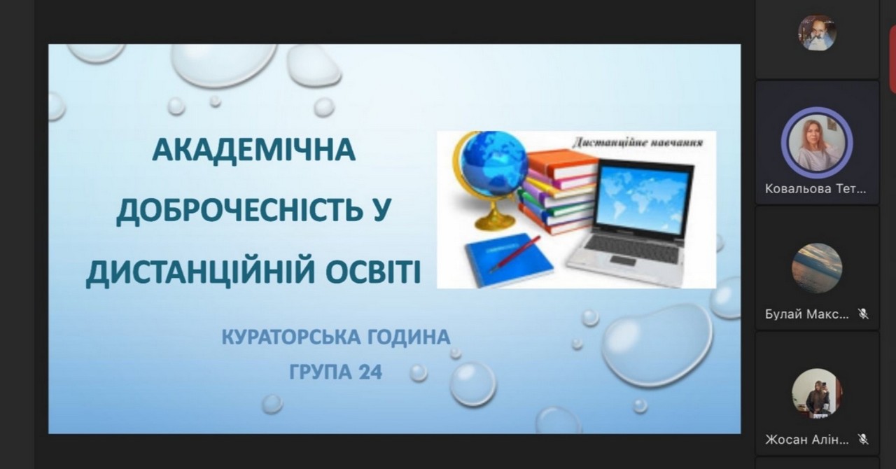 18 березня 2026 року відбулася кураторська година в онлайн-форматі на тему «Академічна доброчесність у дистанційній освіті» для студентів 2 курсу 4 групи спеціальності 014 Середня освіта (Фізична культура) першого (бакалаврського) рівня вищої освіти Навчально-наукового інституту фізичної культури, спорту та спеціальної освіти. Захід провела куратор академічної групи, викладач кафедри Ковальова Тетяна Михайлівна. Основною метою стало формування усвідомленого ставлення до принципів академічної доброчесності в умовах сучасного дистанційного навчання. Особливу увагу було приділено питанням самостійного виконання завдань, коректного використання джерел інформації та запобігання академічному плагіату. Студенти активно долучилися до обговорення, аналізували типові ситуації порушень, розглядали практичні кейси, пов’язані з онлайн-тестуванням і підготовкою письмових робіт. Захід сприяв розвитку критичного мислення, відповідальності за результати власної навчальної діяльності та утвердженню етичних норм у освітньому середовищі.
