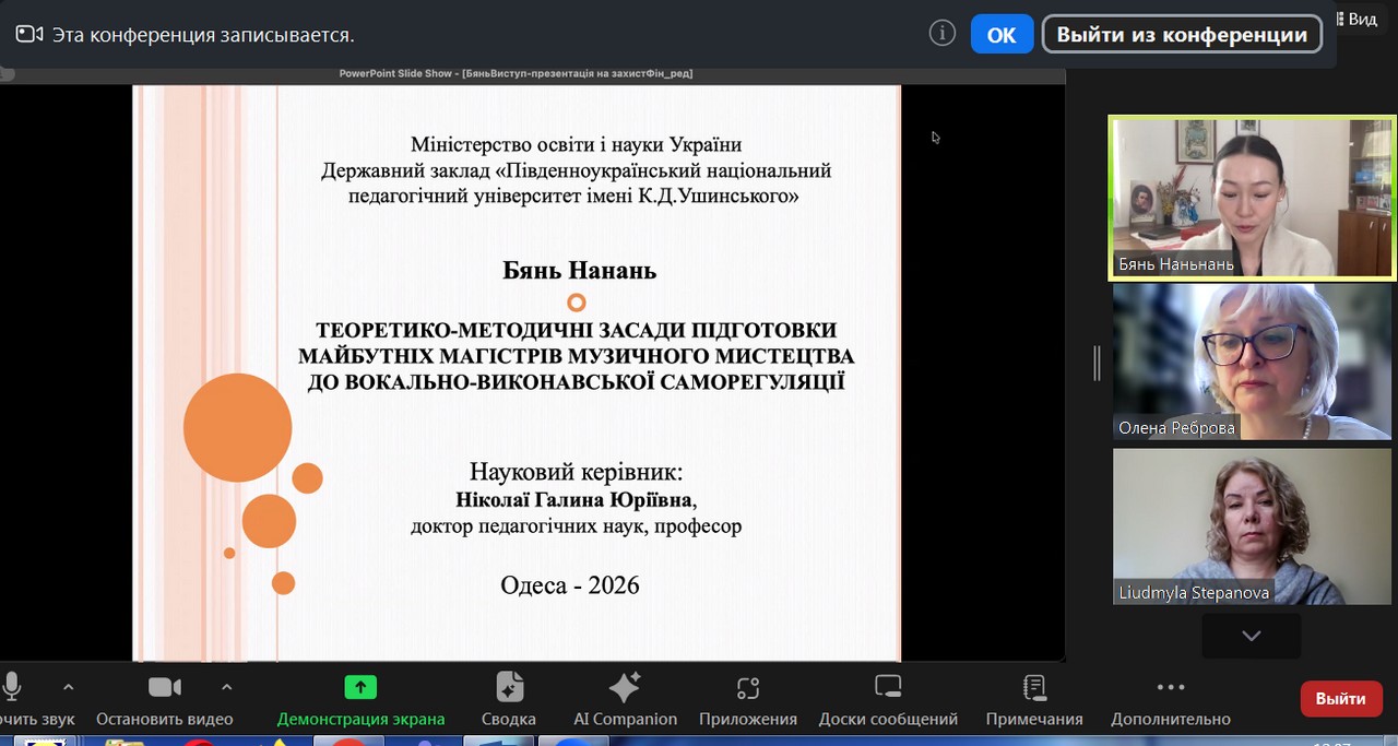 На кафедрі музичного мистецтва і хореографії 17 квітні 2026 року відбувся захист дисертації здобувачки ступеня доктора філософії (PhD) зі спеціальностей 011 Освітні, педагогічні науки ОНП Мистецька педагогіка вищої освіти, громадянки КНР Бянь Наньнань з теми: «Теоретико-методичні засади підготовки майбутніх магістрів музичного мистецтва до вокально-виконавської саморегуляції». Науковий керівник доктор педагогічних наук, професор Г.Ю. Ніколаї.