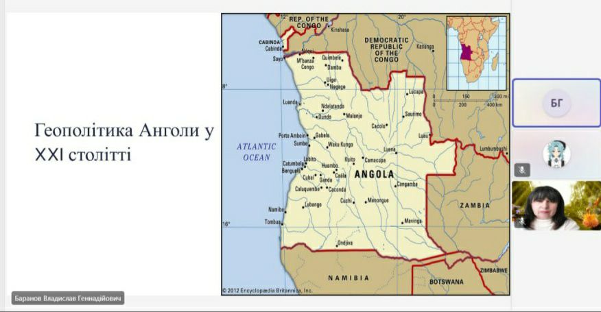 Студент 4 курсу спеціальності «Політологія» Владислав Баранов обрав для дослідження надзвичайно перспективний напрям та створив «Геополітичний портрет Анголи». Глибокий геополітичний, геоекономічний аналіз держави Південно-Західної Африки дозволив довести, що Ангола є петродержавою, яка поєднує логістику міднокобальтових регіонів з атлантичними портами, проводить дипломатичну посередницьку діяльність в конфліктах. Її важливим геоекономічним активом є коридор Лобіто та анклав Кабінда, що посилює державну вагу та посилює позиції у відносинах з світовими гравцями – США, КНР. Ангола вийшла з ОПЕК, прагне суверенного контролю над видобутком критичних мінералів та нафтогазом, проте залишається залежною від передових технологій. Взаємовідносини з Португалією, Бразилією дозволяють створювати вигідні партнерські договори у Південноатлантичному океанічному просторі. Здобувач презентував 3 варіанти сценарію геополітичного розвитку Анголи у період з 2026 до 2035 року, підкресливши багатовекторність зовнішньої політики Анголи та те, що держава є геополітичним вузлом на межі Африканського континенту та Атлантичного океану.