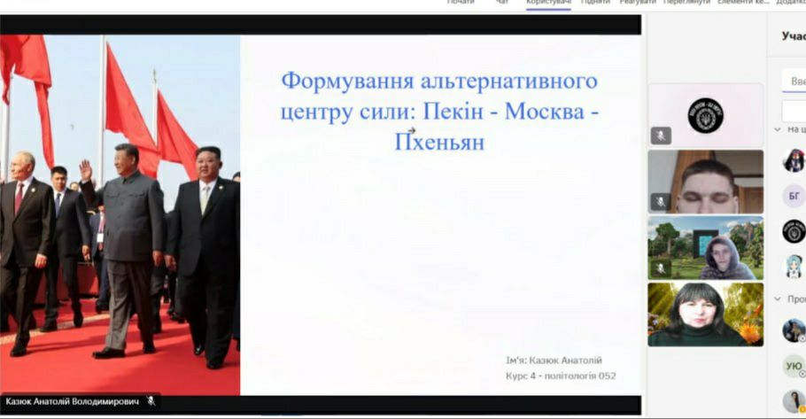 Студенти спеціальності «Політологія» обговорили надзвичайно актуальну тему геополітики та сучасних міжнародних відносин. Студент 4 курсу Анатолій КАЗЮК представив глибоку, структуровану, аналітичну доповідь «Формування альтернативного центру сили Пекін – Москва – Пхеньян».