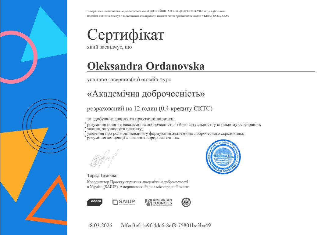 Крім того, у зазначений період науково-педагогічні працівники інституту здійснили підвищення кваліфікації шляхом проходження онлайн-курсу «Академічна доброчесність» на платформі EdEra, що реалізується в межах Проєкту сприяння академічній доброчесності в Україні (SAIUP). Курс обсягом 12 годин (0,4 кредиту ЄКТС) був спрямований на формування системного розуміння принципів академічної доброчесності, ознайомлення з видами академічних порушень і способами їх запобігання, а також на усвідомлення особливостей використання цифрових технологій і штучного інтелекту в освітній діяльності.