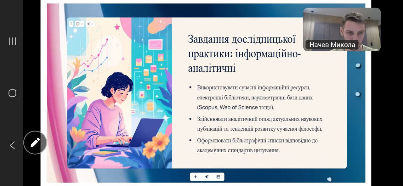 Відбулася настановча конференція з дослідницької практики для здобувачів третього (освітньо-наукового) рівня вищої освіти за освітньо-науковою програмою «Філософія». Захід став важливим етапом організації та методичного супроводу науково-дослідної діяльності аспірантів у межах їхньої професійної підготовки. Зустріч провела Гарант ОНП проф. Оксана Петінова.