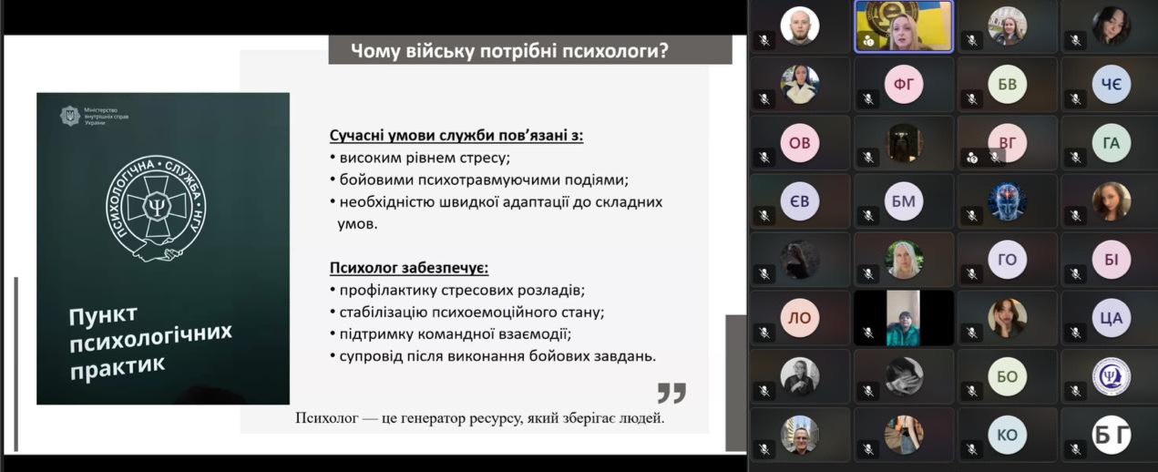 Здобувачі вищої освіти були активно залучені до обговорення, ставили численні запитання та отримали вичерпну інформацію щодо особливостей професійної діяльності військового психолога й перспектив кар’єрного зростання.