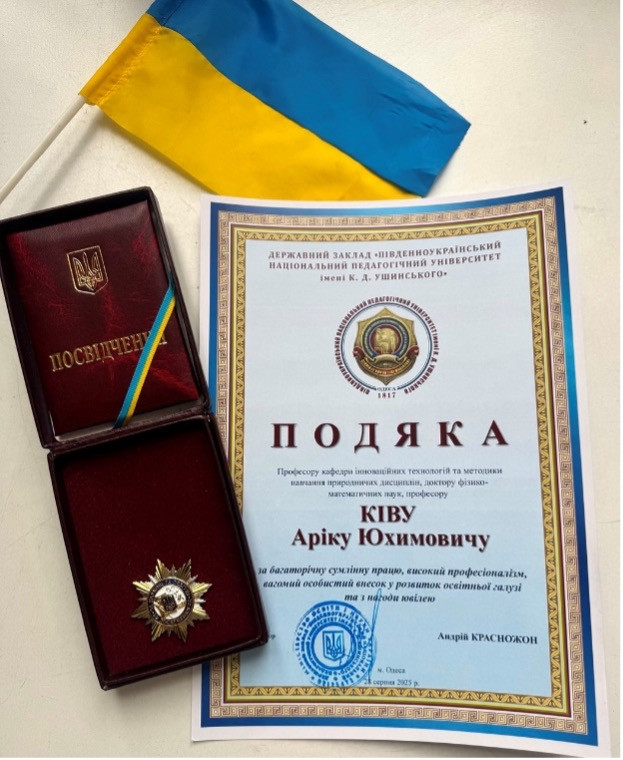 On September 25, 2025, at a meeting of the Academic Council, Arik Yukhymovych Kiv was awarded for many years of conscientious work, high professionalism, significant personal contribution to the development of the educational sector and on the occasion of the anniversary. Professor of the Department of Innovative Technologies and Methods of Teaching Natural Disciplines, Doctor of Physical and Mathematical Sciences received a badge "For Scientific and Educational Achievements" from the Ministry of Education and Science of Ukraine, as well as Gratitude from Ushynsky University.
