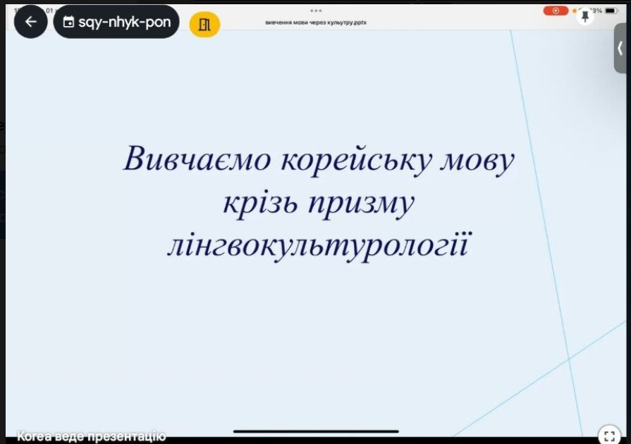 The lecture on the topic "Korean Language through the prism of linguoculturology" was presented by Kinzhybala Oksana Serhiivna, Doctor of Philosophy and Associate Professor of the Department of Languages and Literatures of the Far East and Southeast Asia of Taras Shevchenko National University of Kyiv.