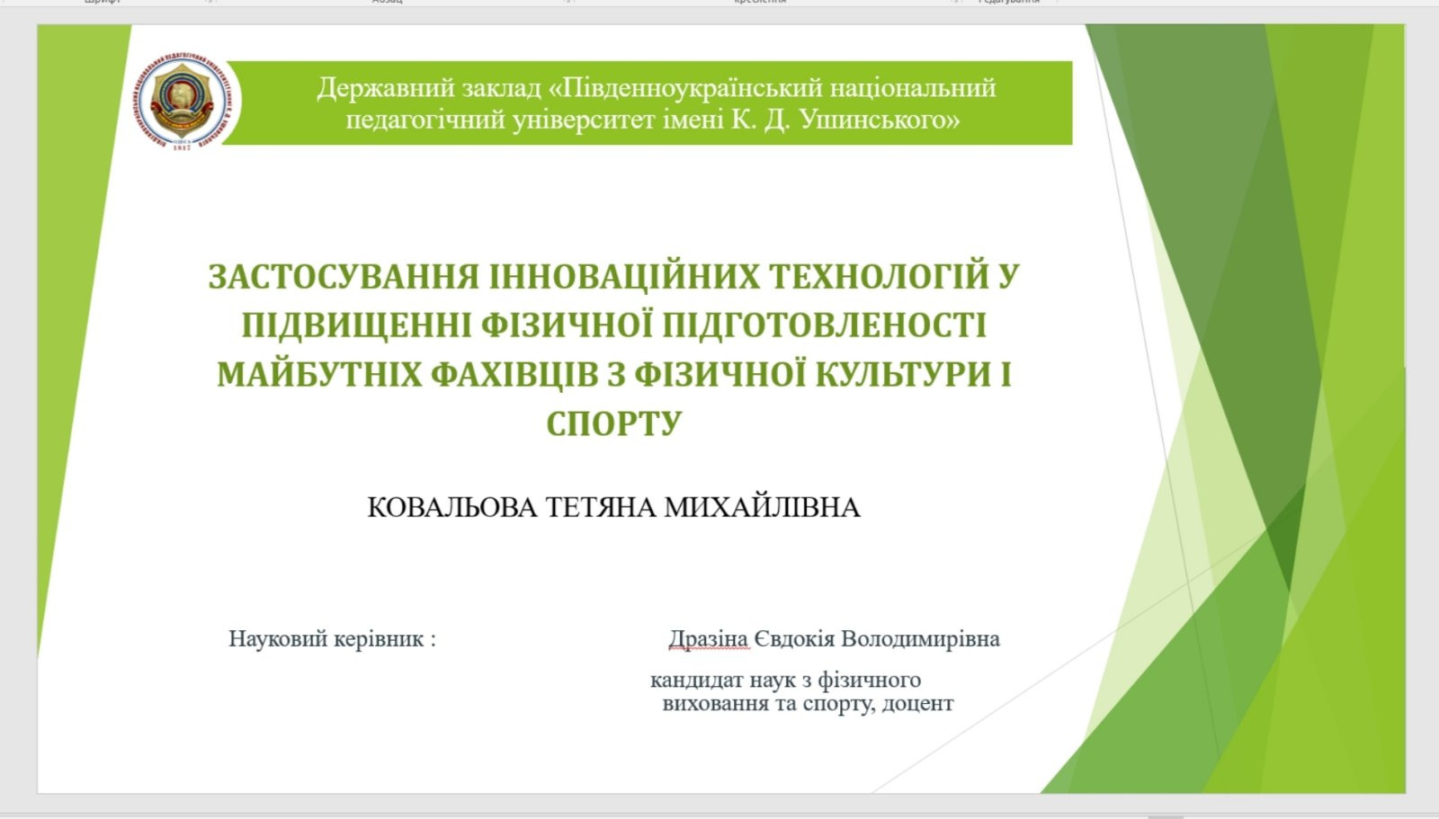 Kovaleva Tetyana Mykhailivna presented the results of the dissertation research on the topic: "Application of innovative technologies in improving the physical fitness of future specialists in physical culture and sports", in which she highlighted the theoretical foundations, practical significance and scientific novelty of the work carried out.