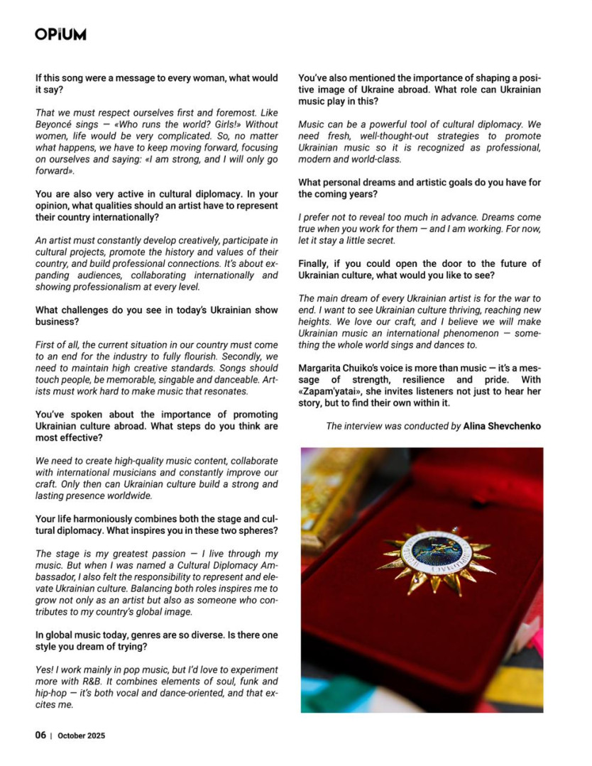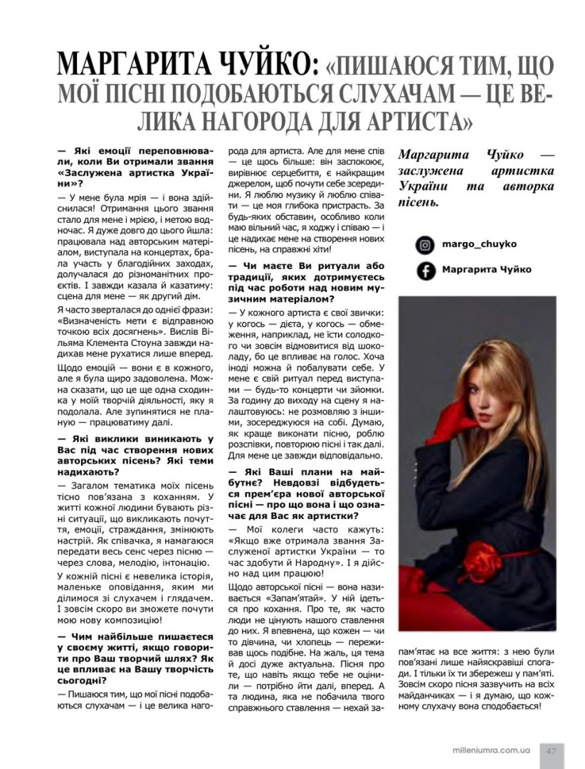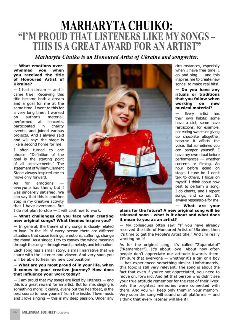 Marharyta says: "I am proud that my songs are liked by listeners - a great award for an artist." And we are proud that such a talented girl studied at Ushynsky University, she became a real ambassador of our Ukrainian song, its author, performer. She sings not only in Ukraine, but also abroad. She gives interviews to famous foreign magazines: "OPIUM", "MILLENIUM BUSSINESS", etc. Her best songs-compositions "Zapam'yatay", "Pozhezha" - became the creative calling card of the "Ambassador of Cultural Diplomacy".