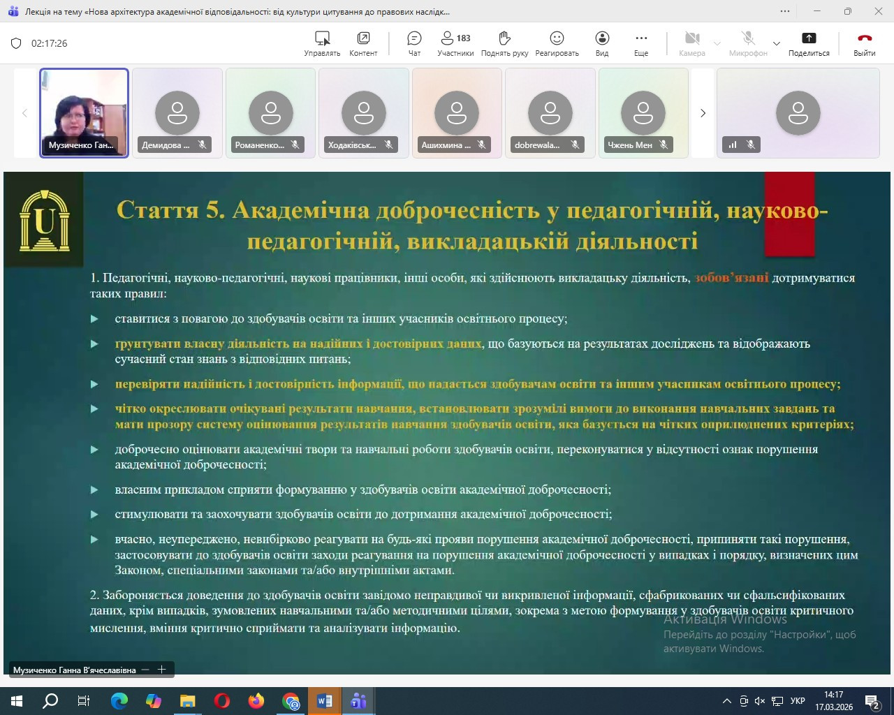 The event considered topical issues of academic integrity in the context of the updated legislative field, in particular, the features of forming a culture of correct citation, preventing plagiarism, and increasing the level of academic responsibility of education seekers and scientific and pedagogical workers. Special attention was paid to the legal aspects of violations of academic integrity, as well as new approaches to their prevention and regulation in accordance with current regulatory changes. Participation in the lecture contributed to the deepening of the scientific and methodological training of postgraduate students, the formation of their research culture and the awareness of the importance of adhering to the principles of academic integrity in educational and scientific activities.