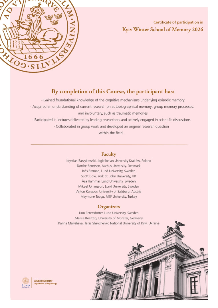 Бондаренко Оксана, магістрантка ОПП «Клінічна психологія» взяла участь у Київській міжнародній зимовій школі пам'яті, яку організував факультет психології Київського національного університету імені Тараса Шевченка і Українська психологічна асоціація разом із шведськими колегами з Лундського університету.