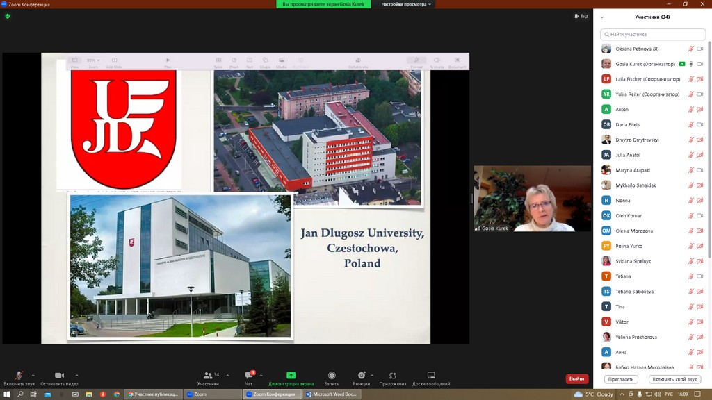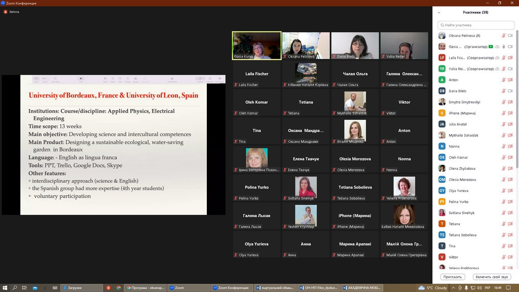 Теми, що розглядалися: Основи віртуального обміну, його види та форми; приклади віртуального обміну з різних дисциплін; головні принципи організації проєктів з віртуального обміну; технології для впровадження віртуального обміну; головні складнощі при впровадженні віртуального обміну; адміністративні аспекти впровадження проєктів віртуального обміну Вебінар проводила спікер з міждисциплінарної професійної організації у сфері віртуального обміну у ВНЗ «UNICOllaboration» Dr. Malgorzata Kurek (Jan Dlugosz University, Poland).