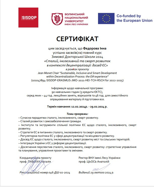 Здобувачі третього (освітньо-наукового) рівня вищої освіти ОНП «Філософія» успішно завершили навчання в зимовій докторській школі 2024 за темою «Сталий, інклюзивний та смарт розвиток в контексті децентралізації: досвід ЄС».