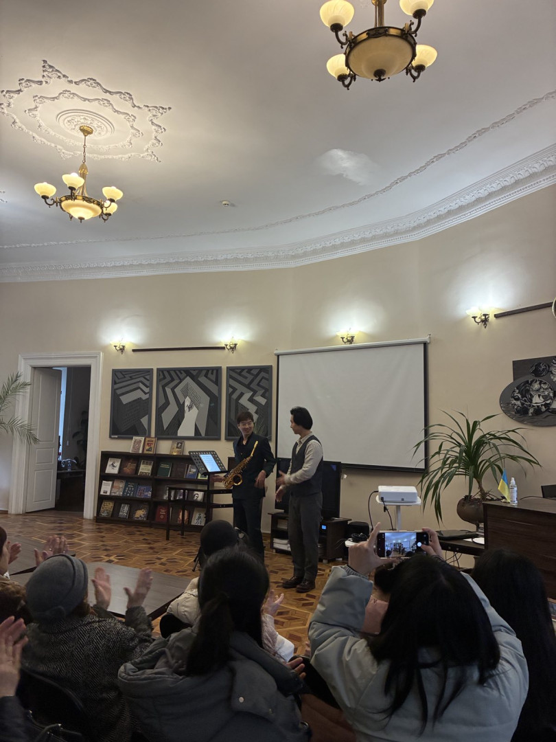 Справжньою кульмінацією концерту став вихід на сцену наших аспірантів, які вкотре довели свій високий фаховий рівень та вміння інтегрувати різні музичні традиції. Саксофоніст Чжоу Тайю (у дуетах під супровід Ху Ї та Юй Ціцзя) і вокаліст Лю Чжиго (партія фортепіано – Юй Ціцзя) зачарували слухачів чуттєвим та майстерним виконанням китайських творів. Ці виступи яскраво продемонстрували віртуозну техніку, виконавську культуру та зрілу ансамблеву майстерність наших здобувачів.