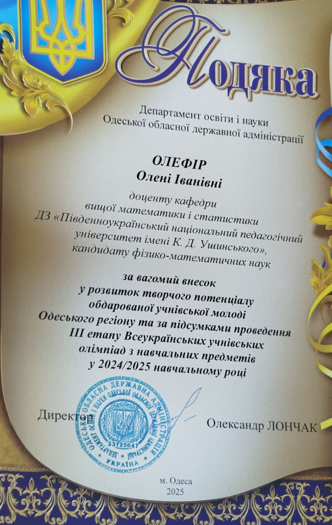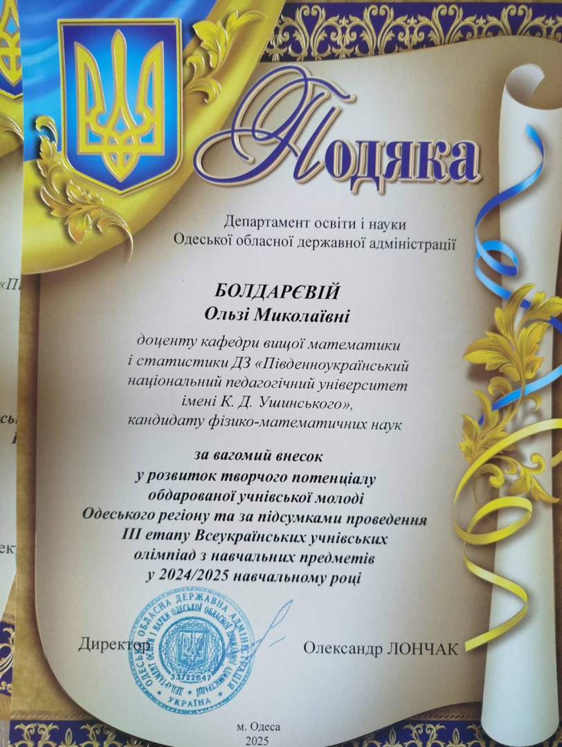 Крім того, доценти кафедри Олефір Олена Іванівна і Болдарєва Ольга Миколаївна були нагороджені грамотами Департаменту освіти і науки Одеської обласної державної адміністрації «За вагомий внесок у розвиток творчого потенціалу обдарованої учнівської молоді Одеського регіону».