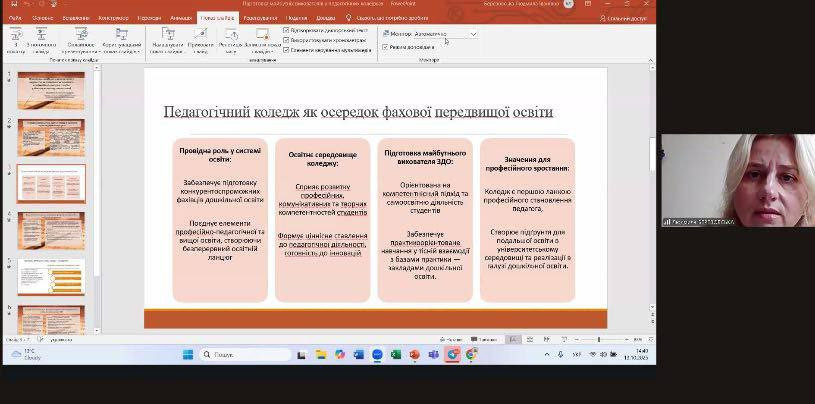 Професорка Людмила Березовська виступила з доповіддю на тему «Підготовка майбутніх вихователів у педагогічних коледжах як основа їх професійної самореалізації в університетському середовищі». Доповідачка звернула увагу на реалізацію компетентнісного підходу у процесі підготовки майбутніх вихователів закладів дошкільної освіти, підкресливши, що педагогічний коледж є першою ланкою професійного становлення майбутніх фахівців.
