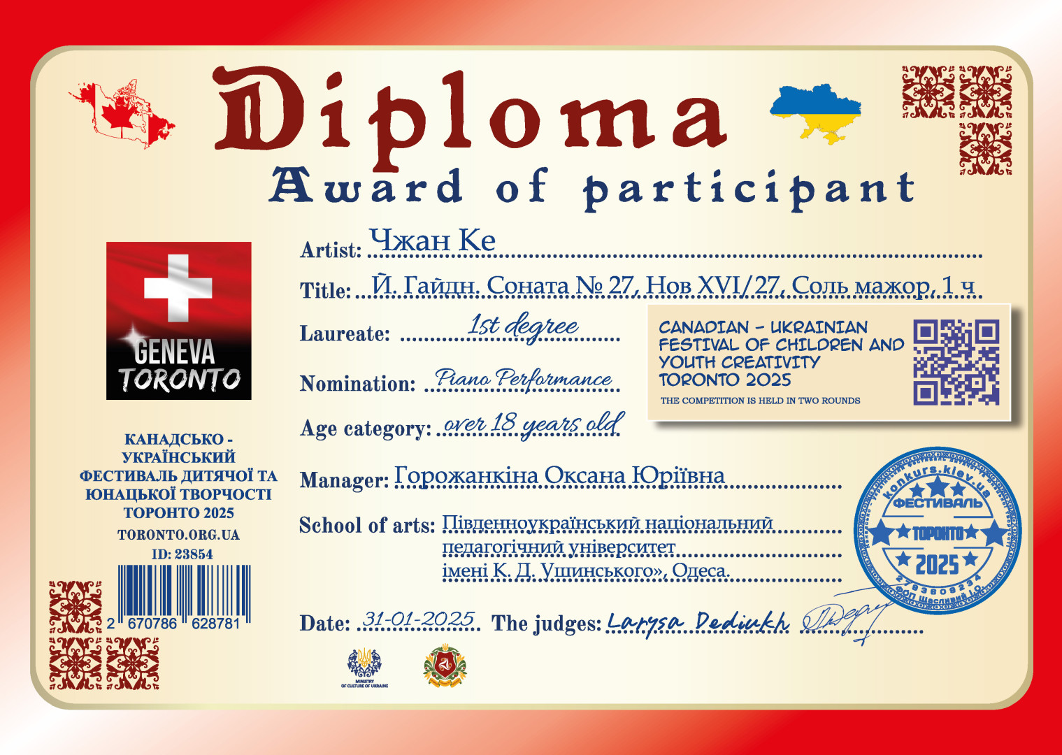Чжан Ке – Лауреат 1 премії Канадсько-українського фестивалю дитячої та юнацької творчості Торонто 2025 “Женева-Торонто” (клас доц. Горожанкіної О. Ю.).