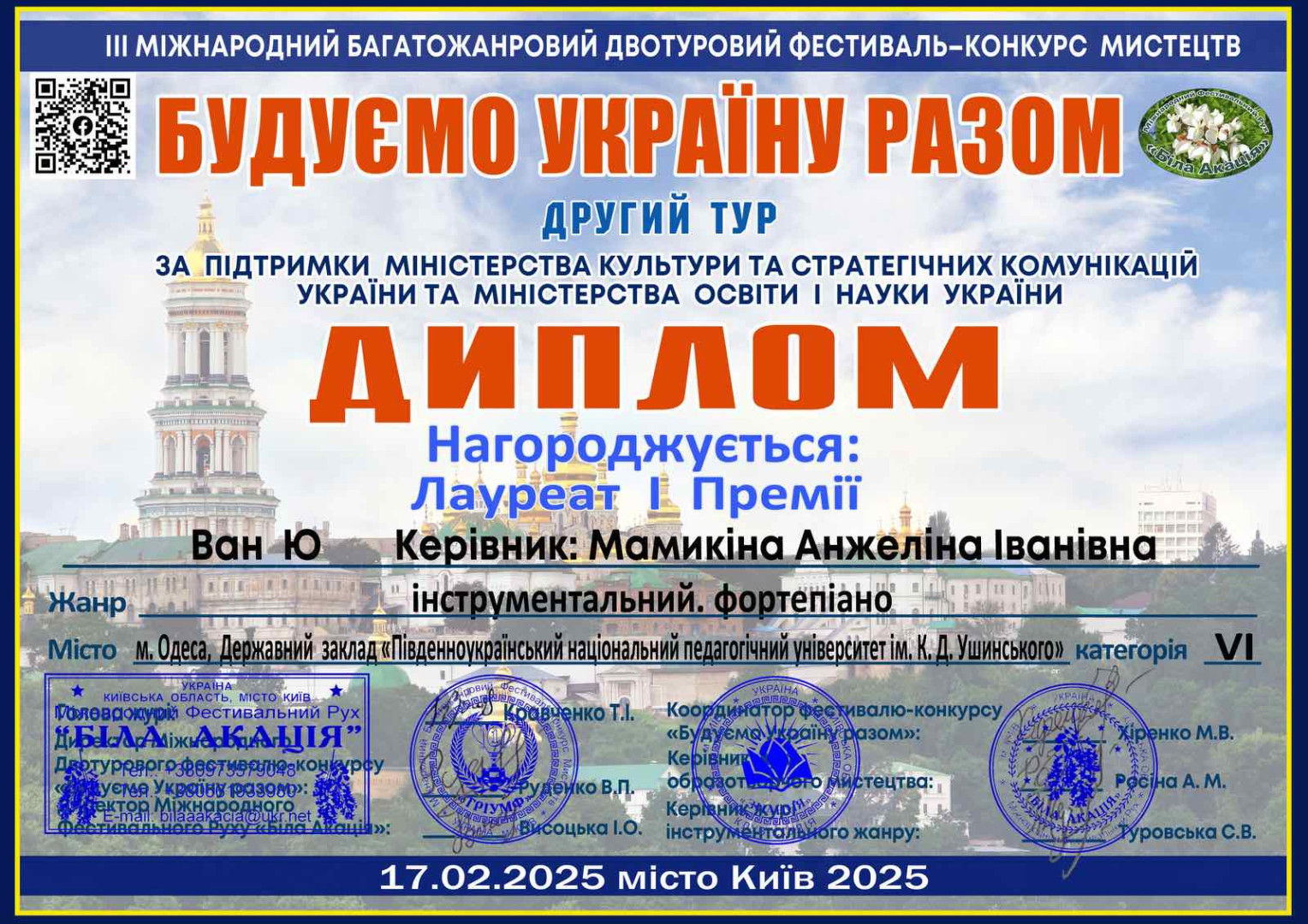 Ван Ю – Лауреат 1 премії III Міжнародного двотурового фестивалю – конкурсу «Будуємо Україну разом», м. Київ, за підтримки Міністерства культури та стратегічних комунікацій України та Міністерства освіти і науки України (клас ст. викл. Мамикіної А. І.);