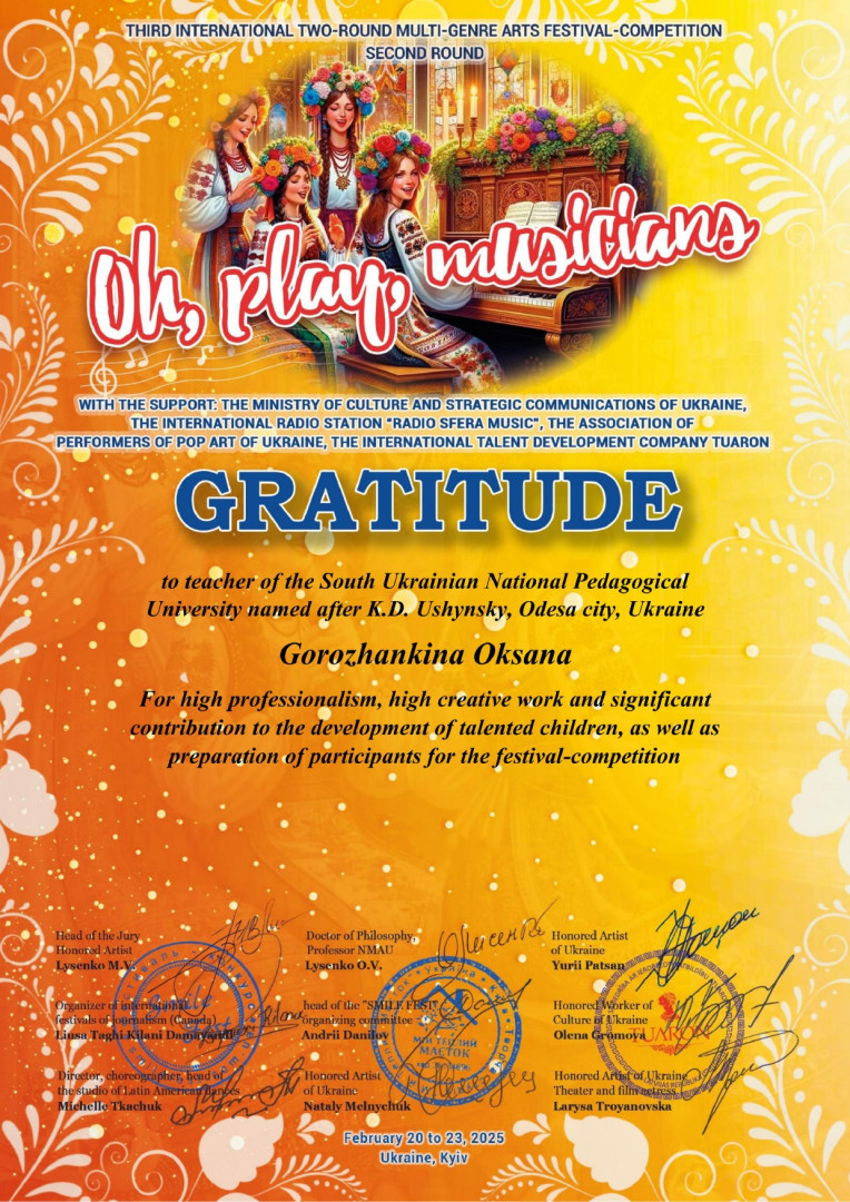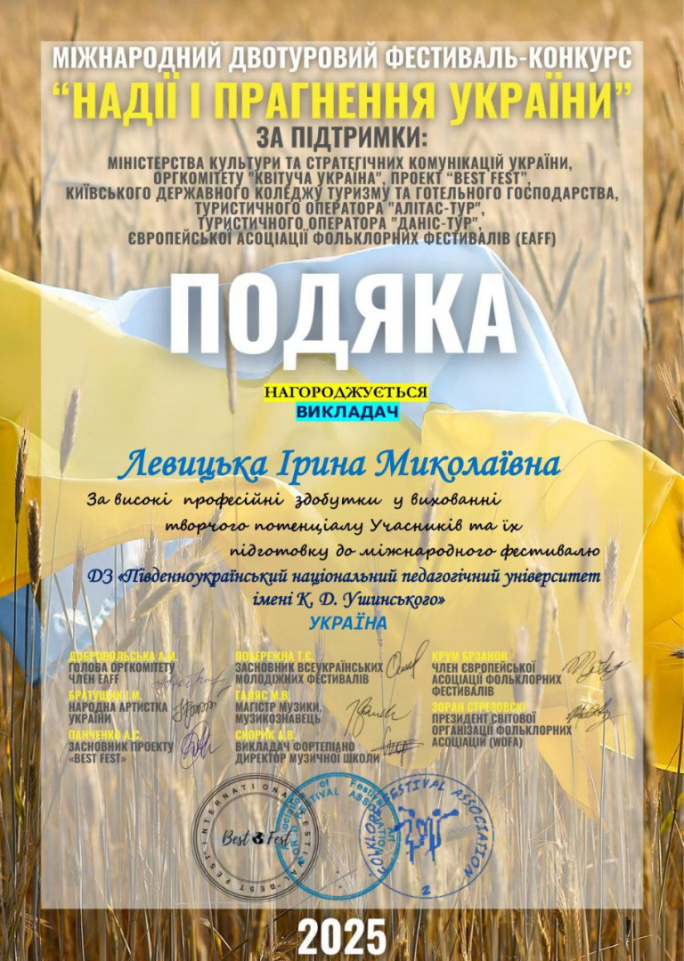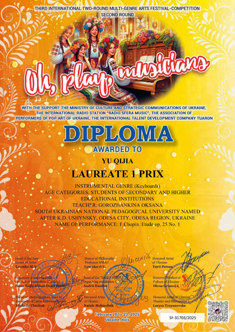 Юй Ціцзя – Лауреат 1 премії ІV Міжнародного двотурового фестивалю-конкурсу мистецтв «До небес долетять голоси - 2025», м. Харків, за підтримки Міністерства культури та стратегічних комунікацій України (клас доц. Горожанкіної О. Ю.);