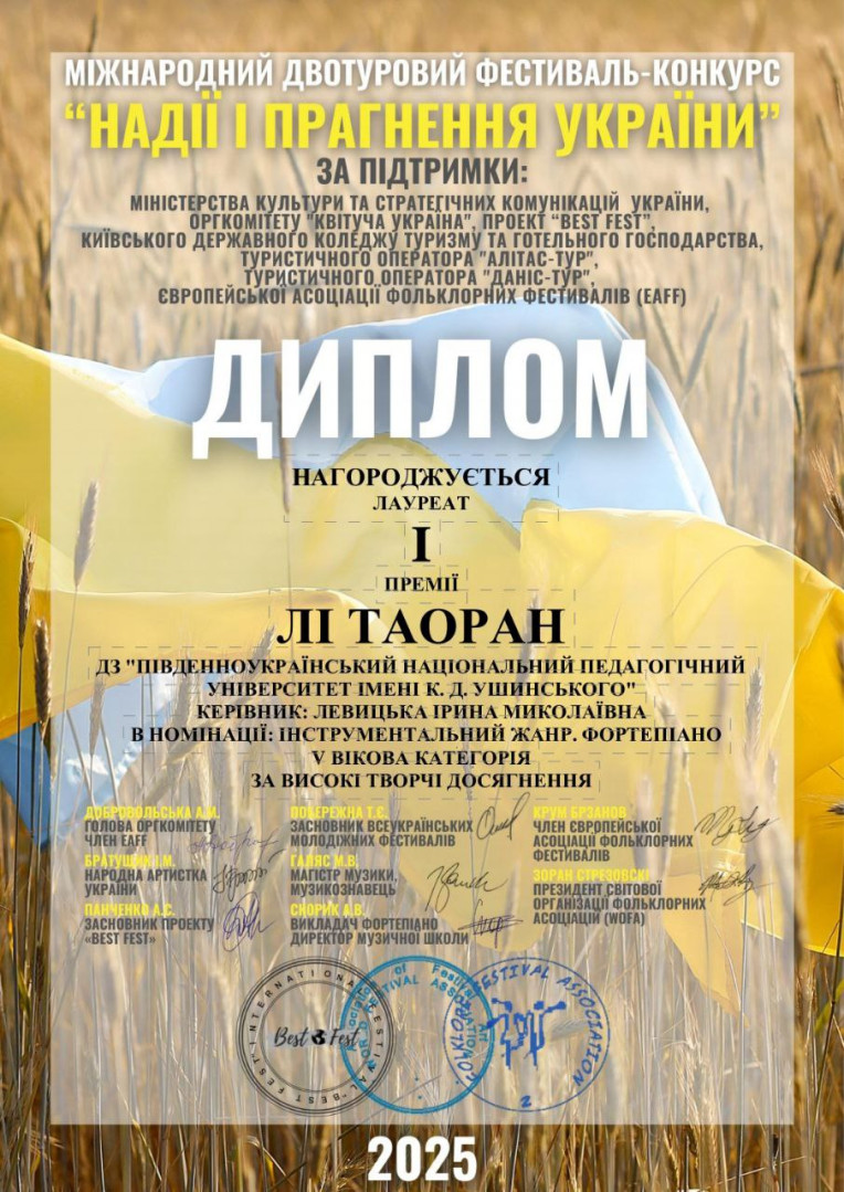 Лі Таоран – Лауреат 1 премії Міжнародного двотурового фестивалю-конкурсу мистецтв «Надії і прагнення України», м. Київ, за підтримки Міністерства культури та стратегічних комунікацій України (клас доц. Левицької І. М.);
