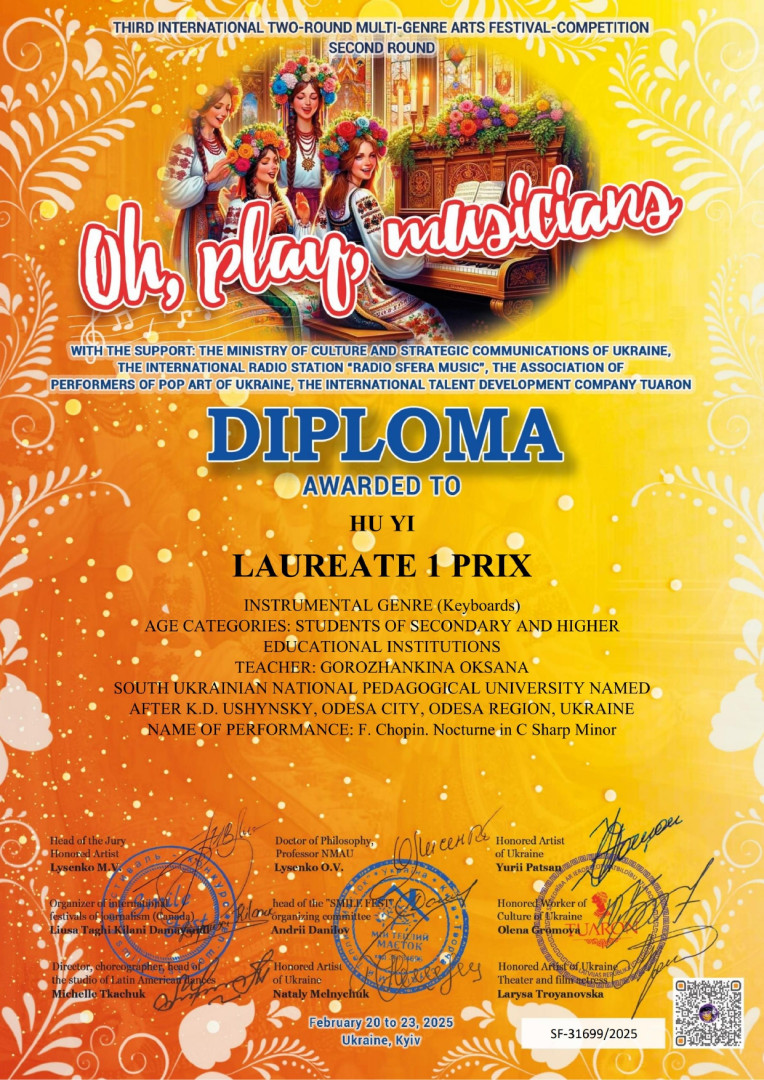 Ху Ї – Лауреат 1 премії ІІІ Міжнародного двотурового фестивалю-конкурсу мистецтв ім. М. В. Лисенка «Ой, заграйте, музиченьки!», м. Київ, за підтримки Міністерства культури та стратегічних комунікацій України (клас доц. Горожанкіної О. Ю.);