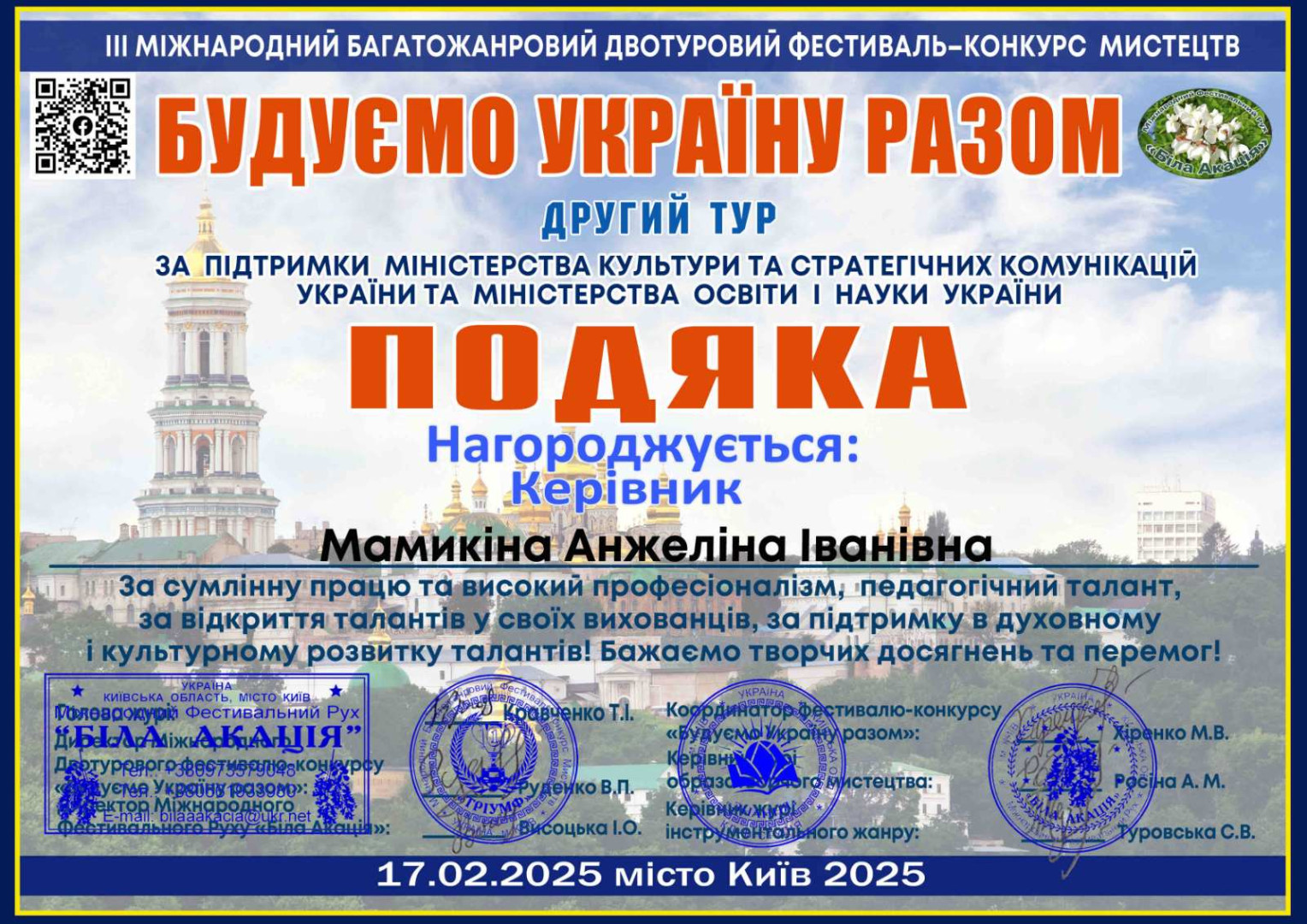 Щиро вітаємо наших перможців та їх керівників і бажаємо подальших творчих успіхів і яскравих перемог під мирним небом України!