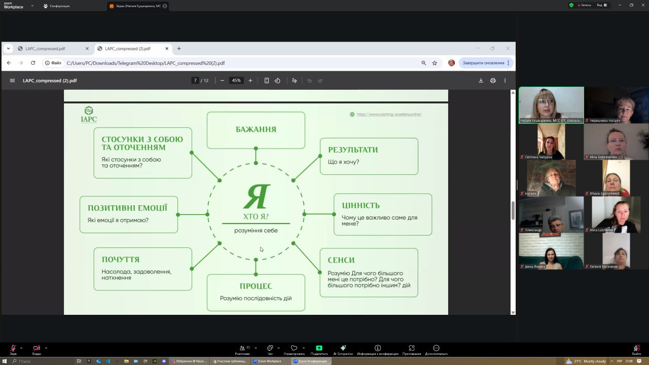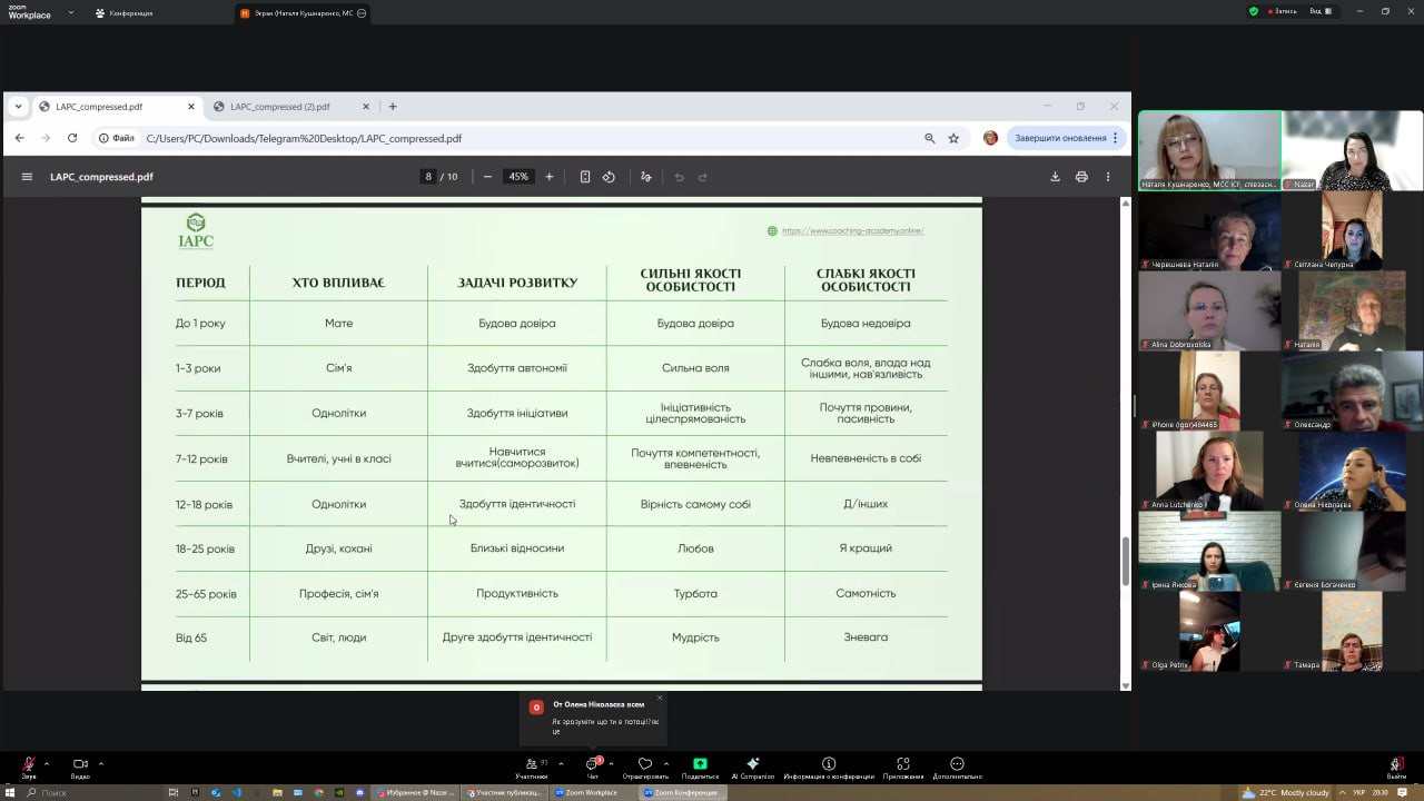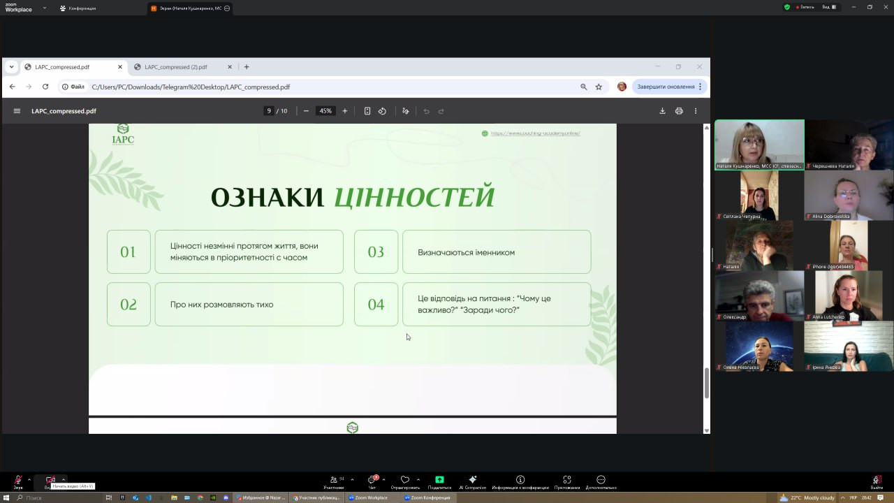 Відбувся інтенсив Наталі Кушнаренко – коучині MCC ICF, менторки, супервізорки та співзасновниці Міжнародної Академії Професійного Коучингу, до якого долучилися науково-педагогічні працівники кафедри та здобувачі третього (освітньо-наукового) рівня вищої освіти спеціальності «Філософія» (Микола Начев, Сергій Карастан, Віолета Світлицька, Ігор Усатюк та інші) разом із Гарантом ОНП проф. Оксаною Петіновою. Подія стала важливою нагодою для учасників замислитися над тим, що саме визначає їхні рішення й життєві орієнтири. Адже цінності – це невидимий компас людини, який скеровує не лише у професійній діяльності, а й у побудові відносин, прийнятті відповідальності та розвитку внутрішньої гармонії. Робота з цінностями допомагає людині усвідомити власний смисловий простір і визначити, які пріоритети є фундаментальними, а які ситуативними. Це створює основу для особистісної свободи та моральної зрілості. Людина, що живе у відповідності до своїх цінностей, здатна гармонізувати внутрішній і зовнішній світи, а отже – діяти цілісно й автентично. Впродовж двох вечорів учасники: