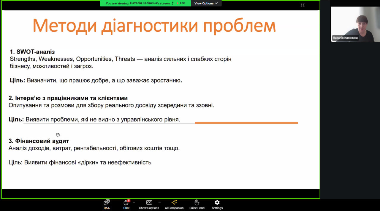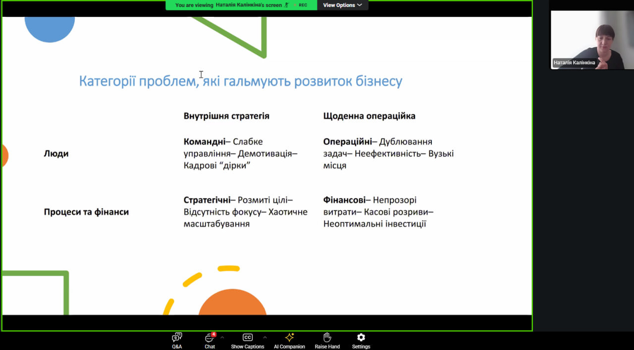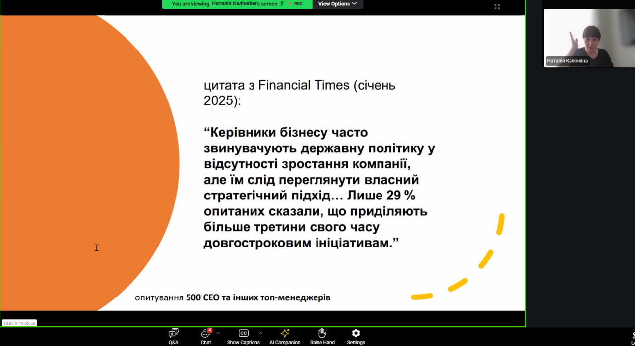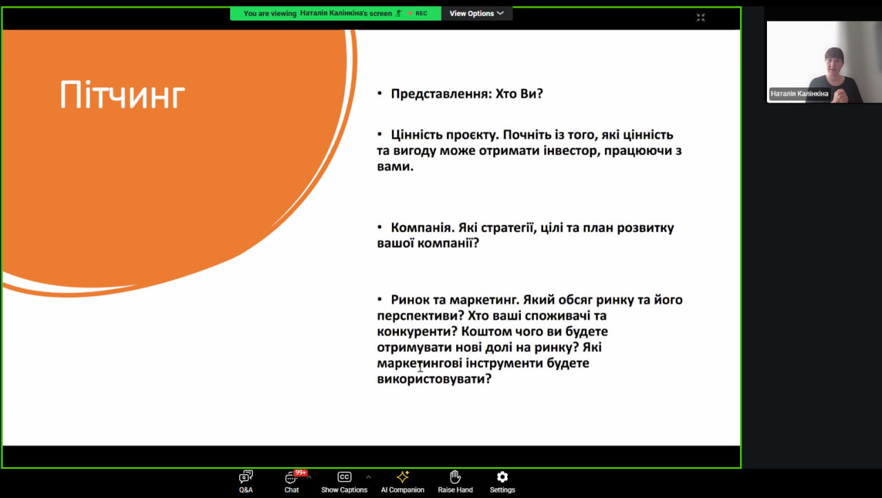 Здобувачі вищої освіти ОПП «Менеджмент соціокультурної діяльності» та ОНП «Філософія бізнесу та соціокультурних практик» у межах вивчення дисциплін «Філософія економіки та бізнесу», «Теорія та практика презентації проєктів» (викладач – проф. Петінова О. Б.) долучилися до науково-практичного семінару, який провела Наталія Калінкіна, директорка з розвитку бізнесу UFuture, CEO інвестиційного акселератора INDAX, Ukraine Global Faculty. Програму заходу було вибудувано навколо ключових проблем сучасного підприємництва: діагностика бар’єрів розвитку бізнесу; механізми залучення інвестицій та особливості взаємодії з донорами й інвесторами; структура бізнес-плану та науково обґрунтовані методики його розробки; аналітичні інструменти оцінювання бізнес-середовища; теоретичні та практичні аспекти презентації інвестиційних проєктів. Науковий акцент семінару полягав у поєднанні практичного досвіду сучасного бізнес-менеджменту з теоретико-методологічними підходами, що ґрунтуються на концепціях економічної філософії, інституціональної теорії та комунікативних моделей у бізнесі. Це забезпечило міждисциплінарний характер дискусії й дозволило здобувачам розглянути бізнес-проєктування не лише як прикладну діяльність, а і як предмет наукового аналізу. Семінар став елементом інтеграції освітнього процесу та бізнес-практики, сприяючи формуванню сучасних професійних та дослідницьких компетентностей студентів, зокрема, захід сприяв розвитку аналітичного та критичного мислення, уміння здійснювати проблемну діагностику бізнесу, оцінювати інвестиційні ризики й аргументовано презентувати результати власних напрацювань у науково-практичному форматі.