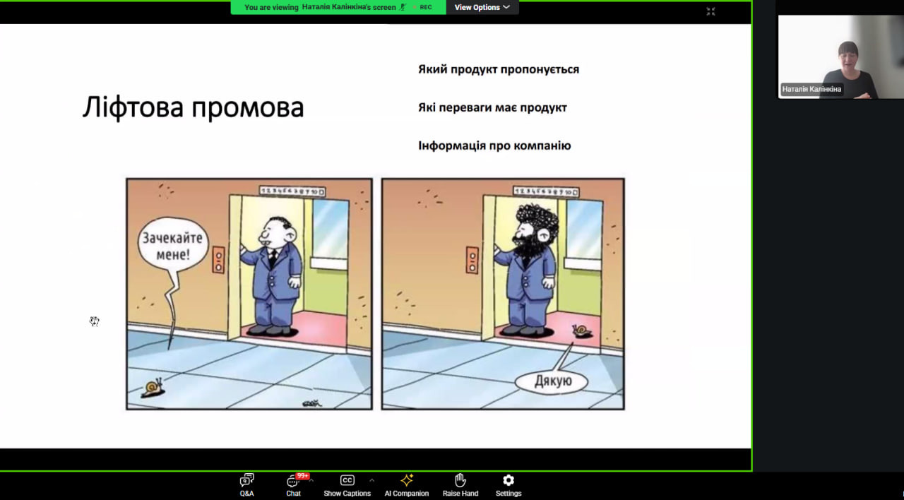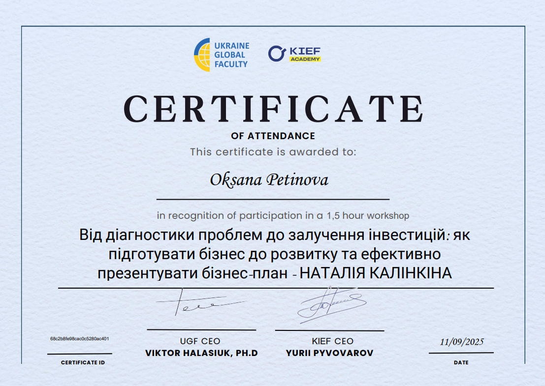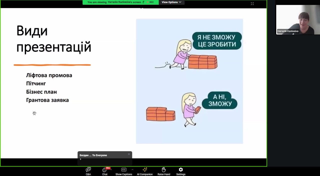Здобувачі вищої освіти ОПП «Менеджмент соціокультурної діяльності» та ОНП «Філософія бізнесу та соціокультурних практик» у межах вивчення дисциплін «Філософія економіки та бізнесу», «Теорія та практика презентації проєктів» (викладач – проф. Петінова О. Б.) долучилися до науково-практичного семінару, який провела Наталія Калінкіна, директорка з розвитку бізнесу UFuture, CEO інвестиційного акселератора INDAX, Ukraine Global Faculty. Програму заходу було вибудувано навколо ключових проблем сучасного підприємництва: діагностика бар’єрів розвитку бізнесу; механізми залучення інвестицій та особливості взаємодії з донорами й інвесторами; структура бізнес-плану та науково обґрунтовані методики його розробки; аналітичні інструменти оцінювання бізнес-середовища; теоретичні та практичні аспекти презентації інвестиційних проєктів. Науковий акцент семінару полягав у поєднанні практичного досвіду сучасного бізнес-менеджменту з теоретико-методологічними підходами, що ґрунтуються на концепціях економічної філософії, інституціональної теорії та комунікативних моделей у бізнесі. Це забезпечило міждисциплінарний характер дискусії й дозволило здобувачам розглянути бізнес-проєктування не лише як прикладну діяльність, а і як предмет наукового аналізу. Семінар став елементом інтеграції освітнього процесу та бізнес-практики, сприяючи формуванню сучасних професійних та дослідницьких компетентностей студентів, зокрема, захід сприяв розвитку аналітичного та критичного мислення, уміння здійснювати проблемну діагностику бізнесу, оцінювати інвестиційні ризики й аргументовано презентувати результати власних напрацювань у науково-практичному форматі.