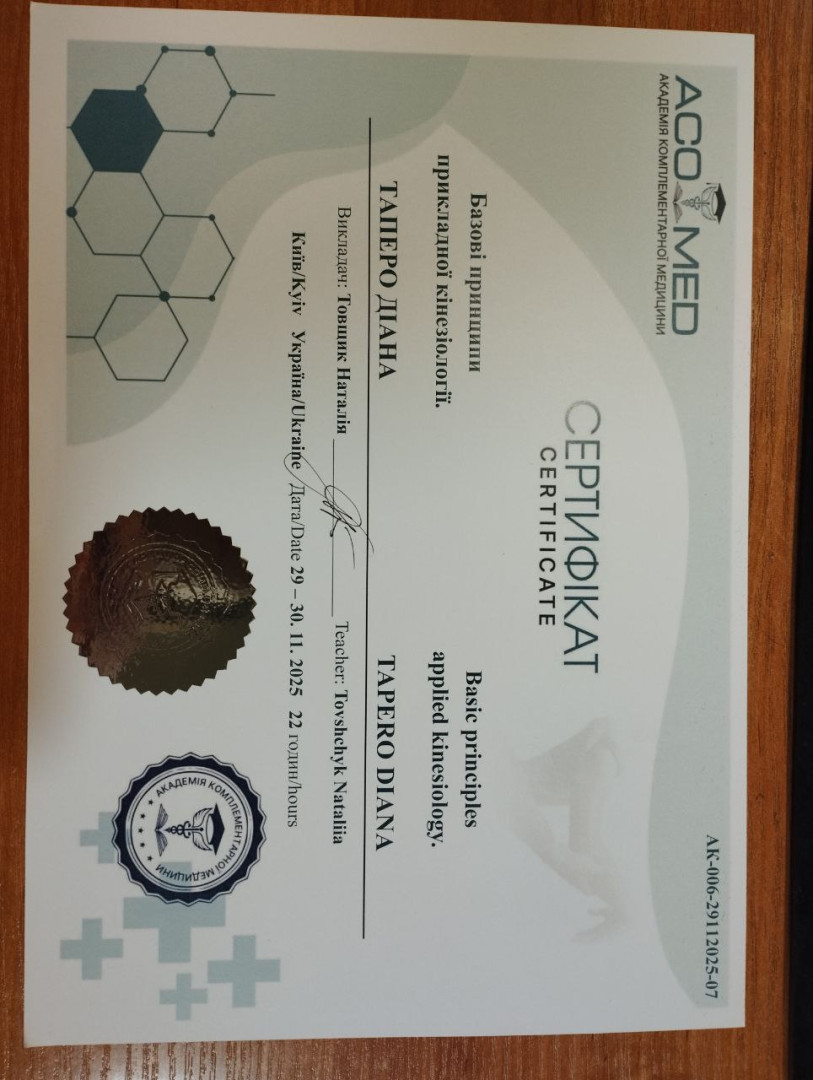 Студентка 2 курсу Діана Таперо разом з доцентом Ольгою Мікулінською відвідали семінар з основ прикладної кінезіології на базі Академії комплементарної медицини (Київ). У ході семінару учасники ознайомилися з методами швидкої діагностики м’язового тонусу, що відкриває нові горизонти для хореографів у роботі з тілом.