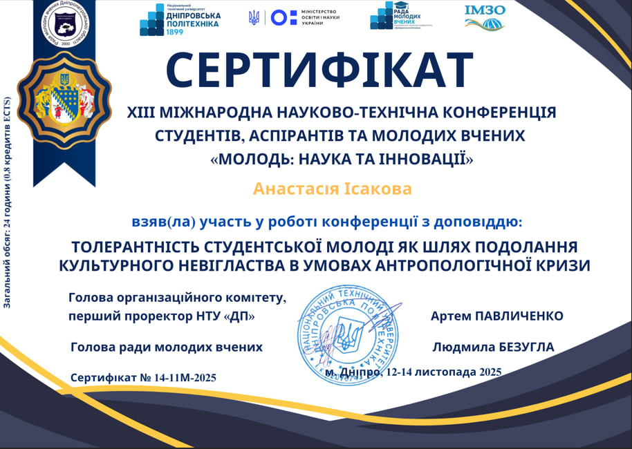 12–14 листопада 2025 року відбулася ХІІІ Міжнародна науково-технічна конференція студентів, аспірантів та молодих учених «Молодь: наука та інновації» (м. Дніпро), до якої на запрошення ЗВО-партнера НТУ «Дніпровська політехніка» долучилися здобувачі вищої освіти нашого університету, в тому числі аспіранти ОНП «Філософія» Неля Чабан, Сергій Карастан, Микола Начев, Ігор Усатюк, Віолета Світлицька, а також члени студентського наукового гуртка «Південноукраїнські наукові студії» (керівник – проф. Оксана Петінова) – Оксана Базелюк, Аліна Шмаленко, Каріна Мусіхіна, Дарина Іскра та інші. Цей захід став важливою платформою для академічного зростання молодих дослідників та обміну науковими ідеями в умовах сучасних суспільних трансформацій. Участь у конференції сприяла презентації наукових результатів та розвитку дослідницької культури й академічної комунікації учасників. У межах секції № 14 «Гуманітарні науки» представлено широкий спектр тем, що відображають актуальні соціокультурні, філософські, педагогічні та економічні виклики сучасності. Зокрема, студентські та аспірантські доповіді були присвячені проблемам формування громадянсько-патріотичної позиції, трансформації ціннісних орієнтацій, ролі мистецтва метамодерну, впливу війни на демократичні практики та соціалізацію особистості, розвитку демократичного освітнього середовища, креативного підприємництва й педагогічних стратегій підтримки молоді в умовах кризи. Проведення конференції ще раз підтвердило, що наукові заходи такого формату є важливим середовищем професійної соціалізації студентів і аспірантів, сприяють розвитку наукової ініціативи, академічної доброчесності та формуванню активної дослідницької позиції молоді.