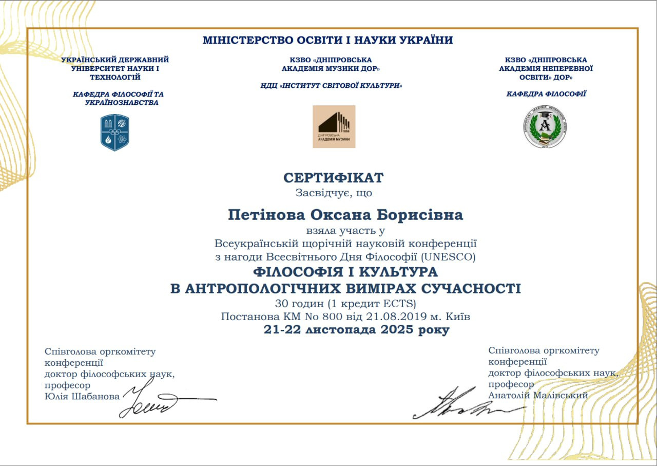 20–21 листопада 2025 року відбулася щорічна наукова конференція «Філософія і культура в антропологічних вимірах сучасності», приурочена до Всесвітнього Дня філософії (UNESCO). Модераторка заходу – проф. Юлія Шабанова, директорка НДЦ «Інститут світової культури», КЗВО «Дніпровська академія музики ДОР» (ЗВО-партнер). Захід об’єднав науковців та здобувачів освіти із різних ЗВО та наукових інституцій. Конференція стала важливою платформою для міждисциплінарного діалогу, обміну науковими ідеями та осмислення актуальних викликів сучасності крізь призму філософії та культури. У межах конференції виступили відомі науковці, які виступили з доповідями, що торкалися актуальних питань філософської антропології, етичних запитів сучасної філософії, соціального виміру людського буття в часі війни та інших.