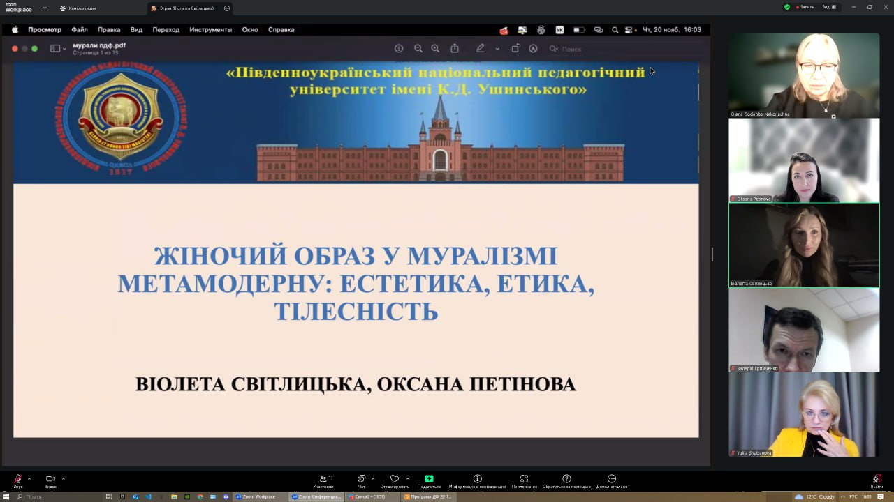 Нашу кафедру представляли здобувачка третього (освітньо-наукового) рівня вищої освіти 4 року навчання Віолета Світлицька та її науковий керівник проф. Оксана Петінова, які в межах секції «Філософсько-естетичні та музикознавчі ракурси культури» презентували тему «Жіночий образ у муралізмі метамодерну: естетика, етика, тілесність». Доповідь була присвячена філософсько-антропологічному та естетичному аналізу жіночої тілесності й образності в сучасному візуальному мистецтві метамодерну, а також порушувала питання етичних смислів, символічних репрезентацій і культурних трансформацій жіночого образу. Матеріали конференції будуть розміщені на платформі Web of Science Core Collection, що підкреслює високий науковий рівень заходу та його значущість для розвитку сучасної гуманітаристики.