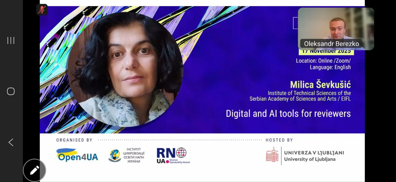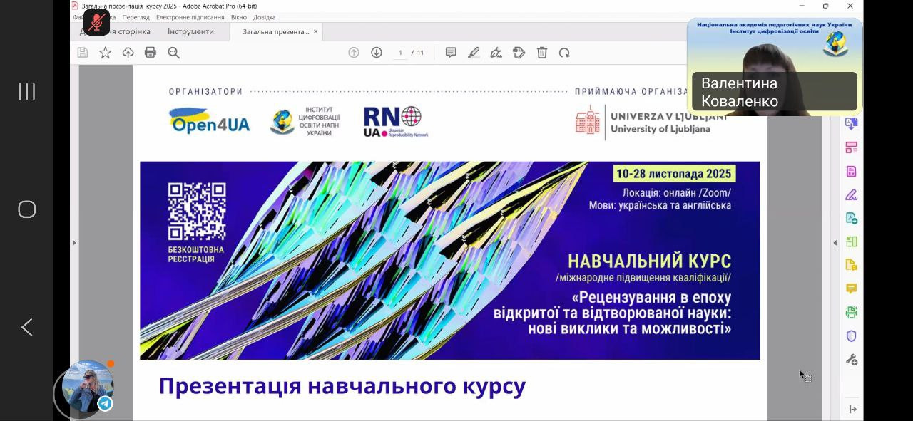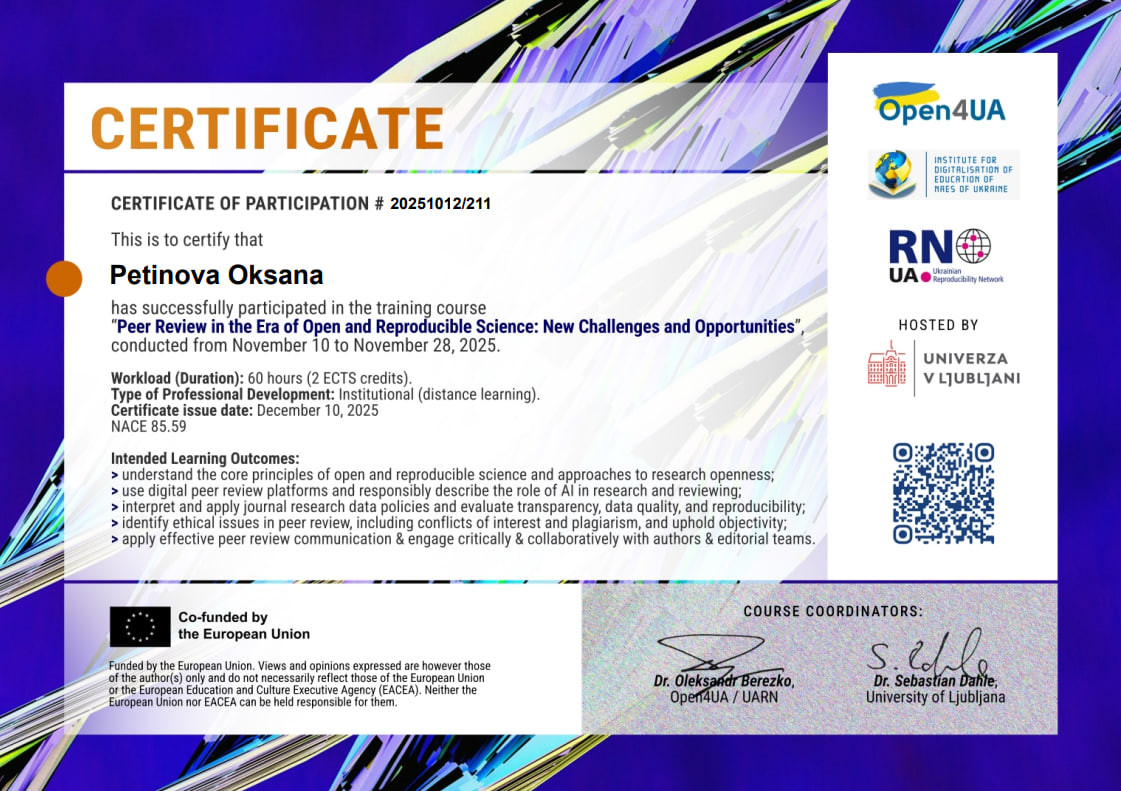 Успішно завершилося проходження міжнародного підвищення кваліфікації за програмою академічної мобільності «Рецензування в епоху відкритої та відтворюваної науки: нові виклики та можливості», яке тривало з 10 листопада по 10 грудня 2025 року у дистанційному форматі, в якому взяла участь проф. Оксана Петінова. Навчальний курс було реалізовано Консорціумом проєкту Open4UA, Інститутом цифровізації освіти НАПН України, Ukrainian Reproducibility Network (UARN) у співпраці з University of Ljubljana (Словенія).