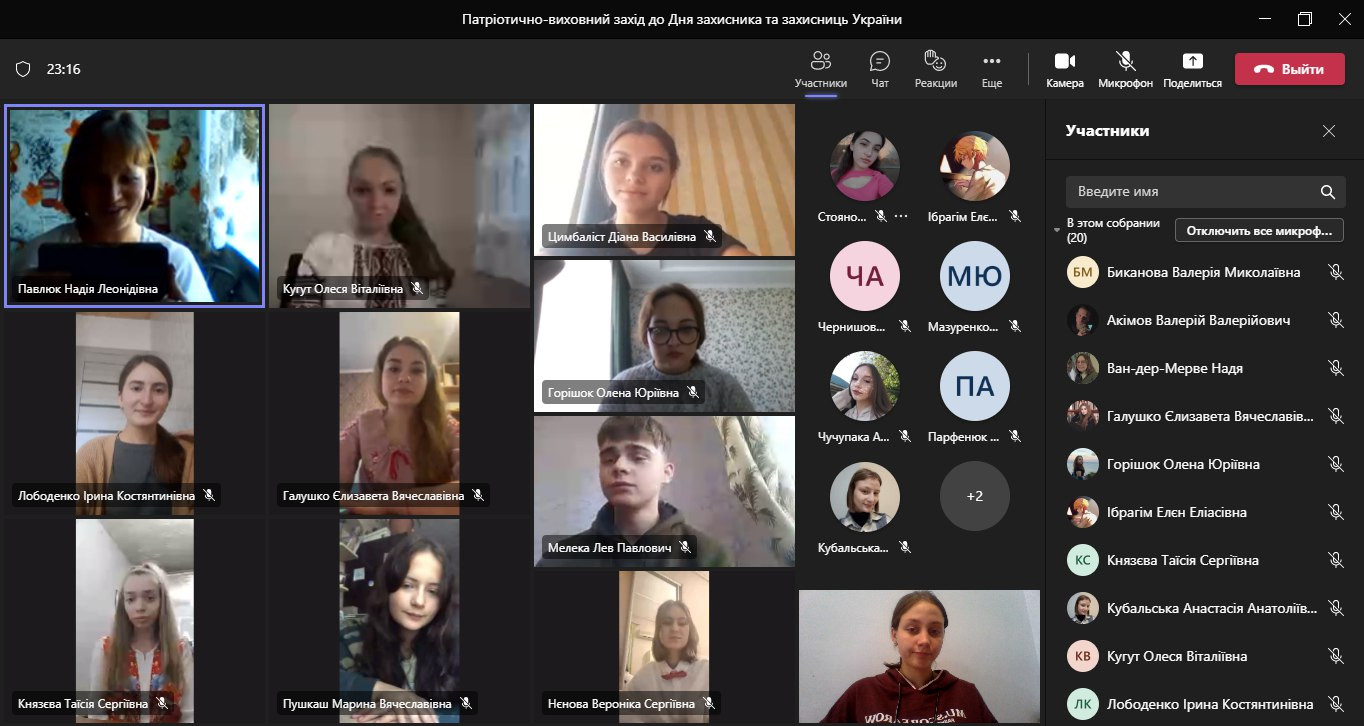 До Дня захисників і захисниць України на платформі teams було проведено патріотично-виховний захід. Студенти першого курсу історико-філологічного факультету під керівництвом викладача кафедри української та зарубіжної літератур Павлюк Н.Л. взяли активну участь у його організації. У супроворді презинтації було розказано історію свята та його значення, продекламовано поезії, а також було намальовано плакат зі словами подяки нашим захисникам.
