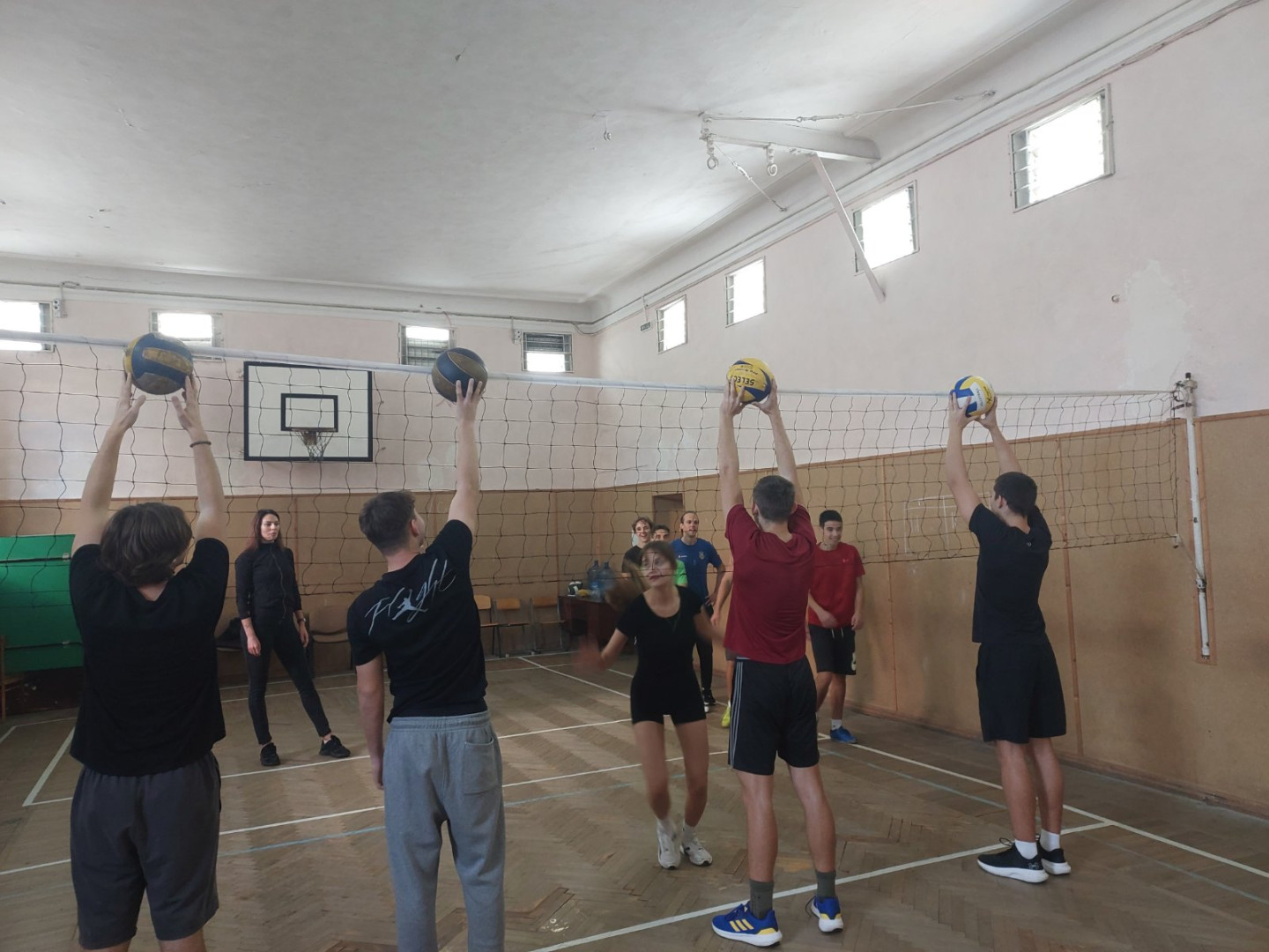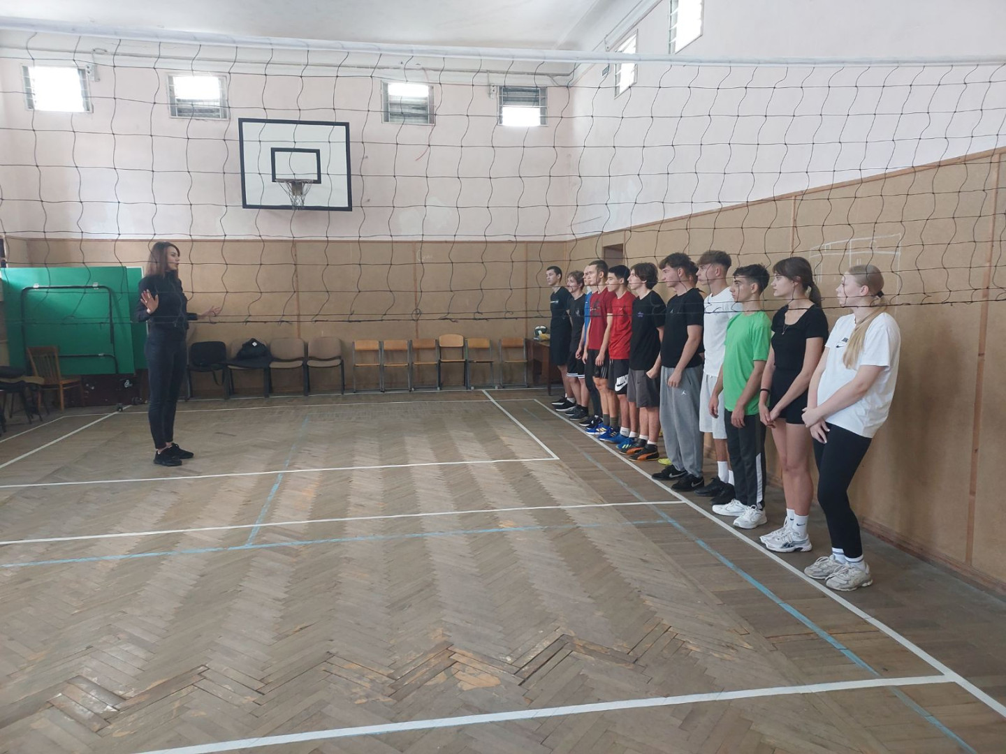 Анастасія Юріївна продемонструвала правильне положення тіла та роботу кистей під час передачі зверху двома руками, а також техніку формування платформи для прийому м’яча знизу. Здобувачі виконували вправи в парах і малих групах, що сприяло швидкому засвоєнню технічних прийомів.