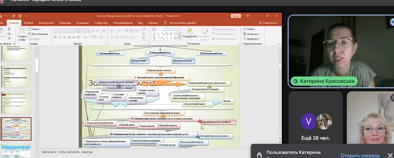 Спікер - кандидат педагогічних наук, доцентка кафедри логопедії та логопсихології Українського державного університету імені Михайла Драгоманова Чередніченко Наталія Володимирівна, яка представила надзвичайно цікавий, фундаментальний, структурований лекційний матеріал за темою порушень писемного мовлення у дітей з тяжкими порушеннями мовлення та у структурі більш складних деструктивних розладів. Було розкрито основні питання діагностики, труднощі засвоєння шкільних навичок, специфічні порушення письма та читання, розкрито зміст комплексного підходу до корекційно-розвивального навчання з дітьми. Було надано багато практичного матеріалу з власного досвіду. Лекція мала бінарний характер, оскільки питання, що розглядались викликали надзвичайну зацікавленість і спонукали до діалогу, додаткових питань діагностики та корекції. Здобувачі мали змогу висловити власні думки, а також зробити змістовні висновки.