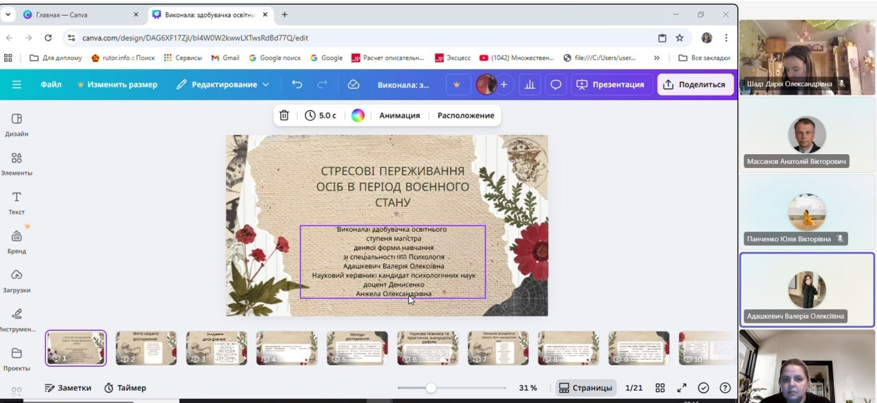 2 грудня 2025 року під час передзахисту кваліфікаційних магістерських робіт здобувачів другого магістерського рівня денної форми навчання за спеціальністю 053 «Психологія» була представлена тематика, що відображає актуальні напрями екстремальної, кризової та прикладної психології в умовах воєнного стану. Магістерські дослідження були присвячені особливостям психологічного стану родин безвісти зниклих та формам їх психологічної підтримки, проблемі емоційного вигорання вчителів в умовах воєнного стану в Україні, впливу емоційного інтелекту на сприйняття стресу у молоді, візуальній оцінці стресового стану людини з метою визначення стратегій взаємодії та корекції, а також особливостям стресових переживань осіб у період воєнного стану, а також інших актуальних проблем сучасної психологічної науки і практики.